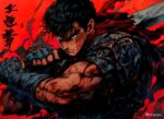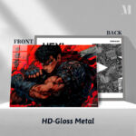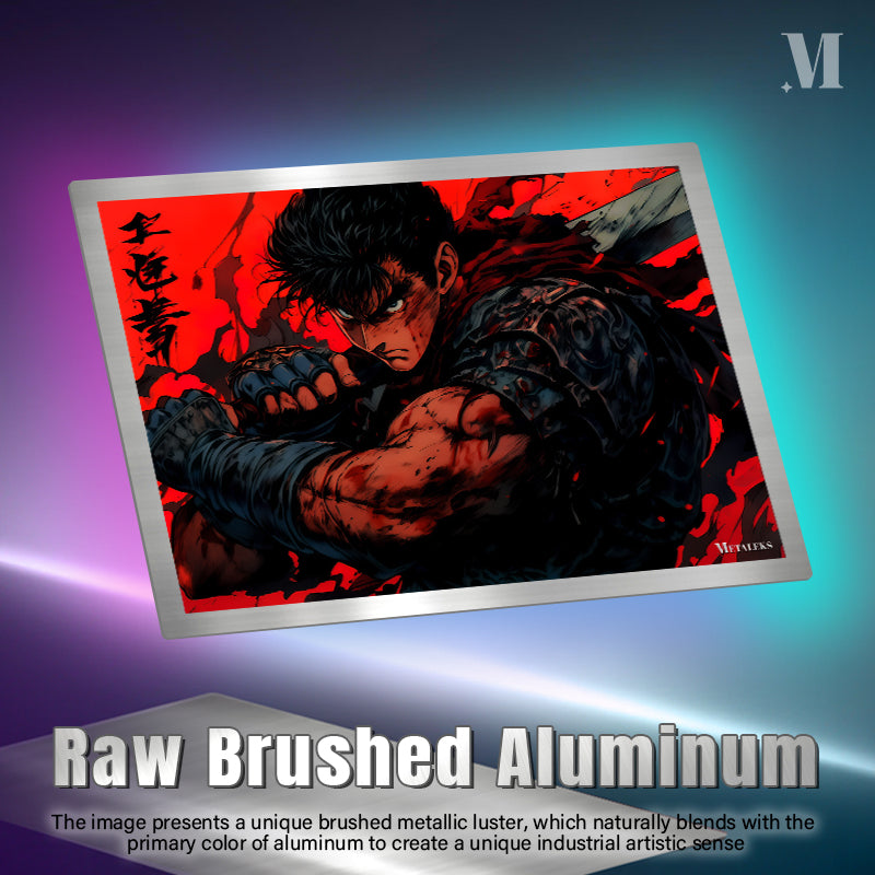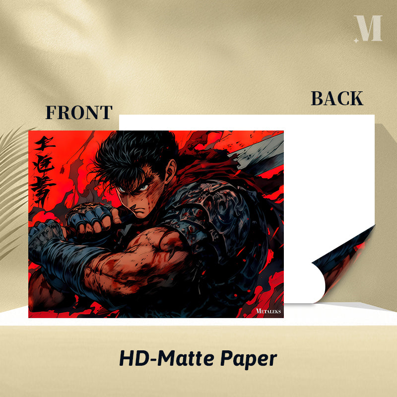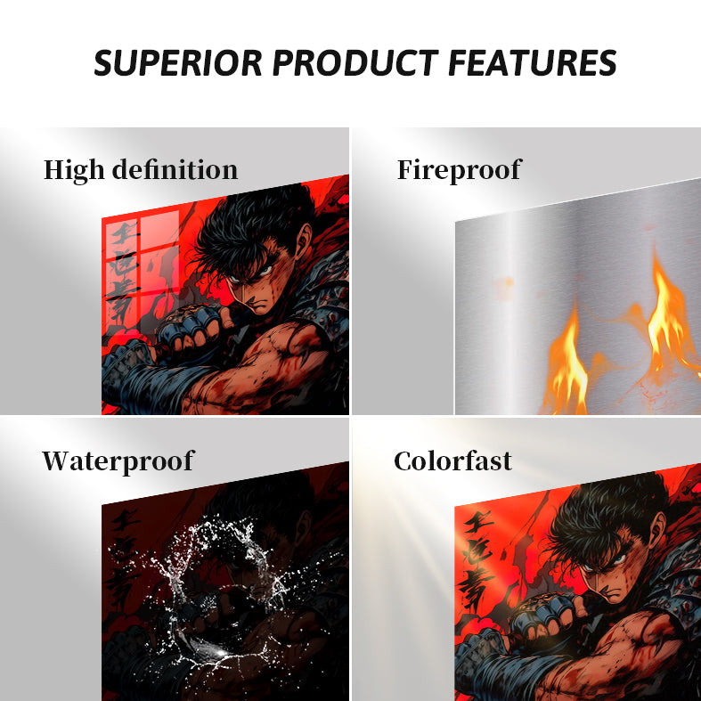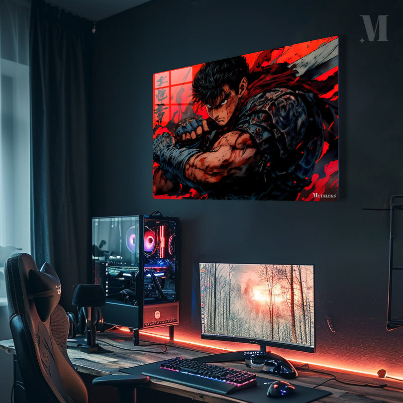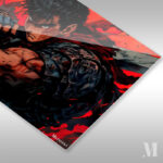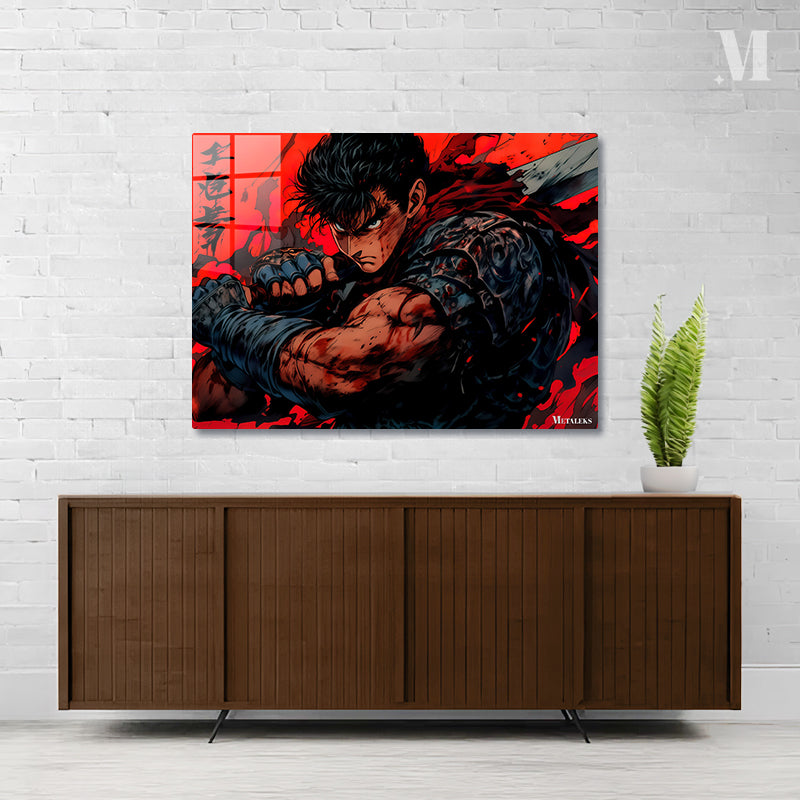 Guts from the work “Berserk” is holding a sword with both hands, his eyes are sharp and determined, and his body is covered with bloodstains, showing a powerful and fierce aura. Metaleks Ultra HD Metal Poster – Create Your Passionate Space.