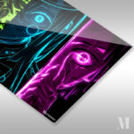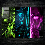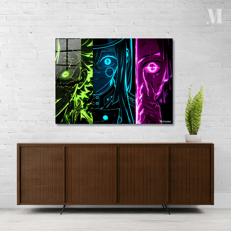 Three animated characters with glowing eyes. The first has a green, menacing eye, the second a blue eye with a symbol, and the third a pink eye with a symbol and a hand gesture. Metaleks Ultra HD Metal Poster – Create Your Passionate Space.