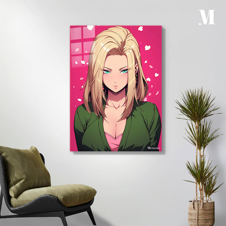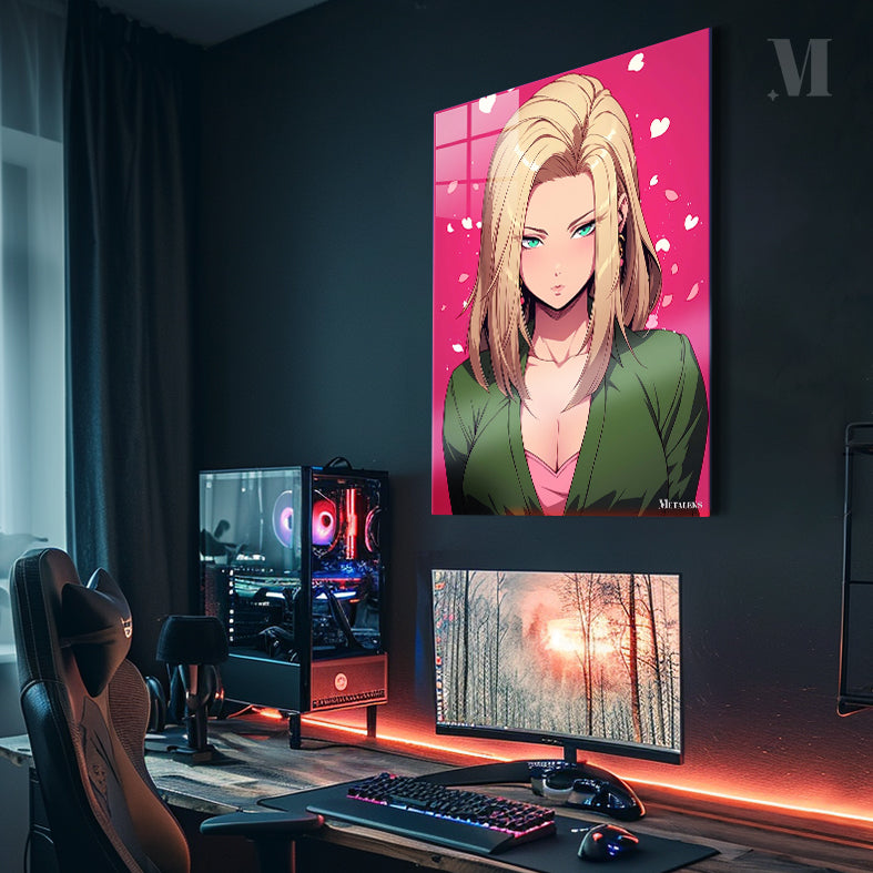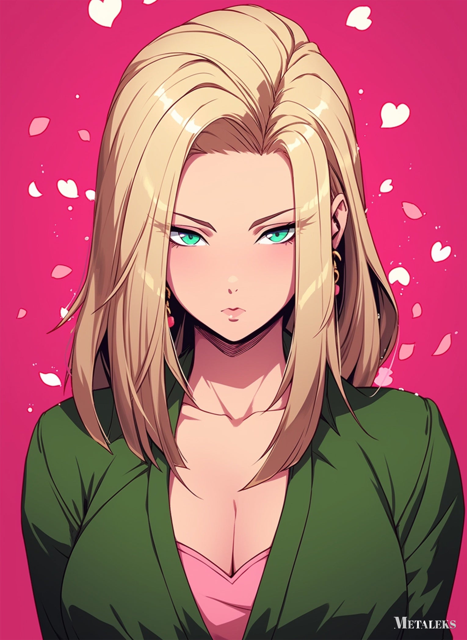 A woman with long blonde hair, wearing a green jacket over a pink top. Metaleks Ultra HD Metal Poster – Create Your Passionate Space.