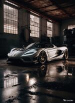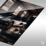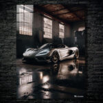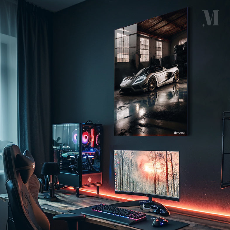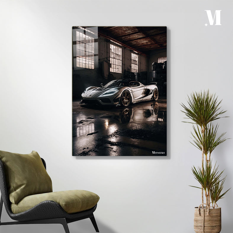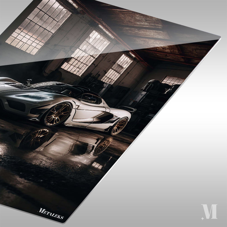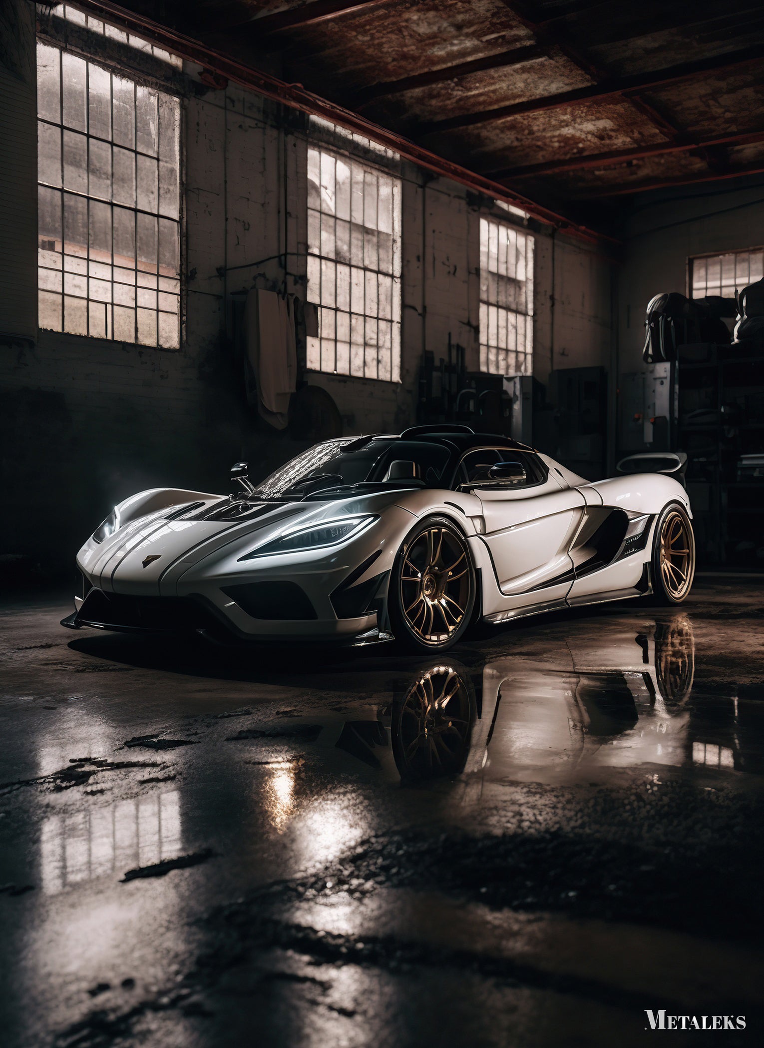 A sleek, modern sports car with a white body and black accents, featuring prominent gold wheels, is parked in a dimly lit industrial space. Metaleks Ultra HD Metal Poster – Create Your Passionate Space.