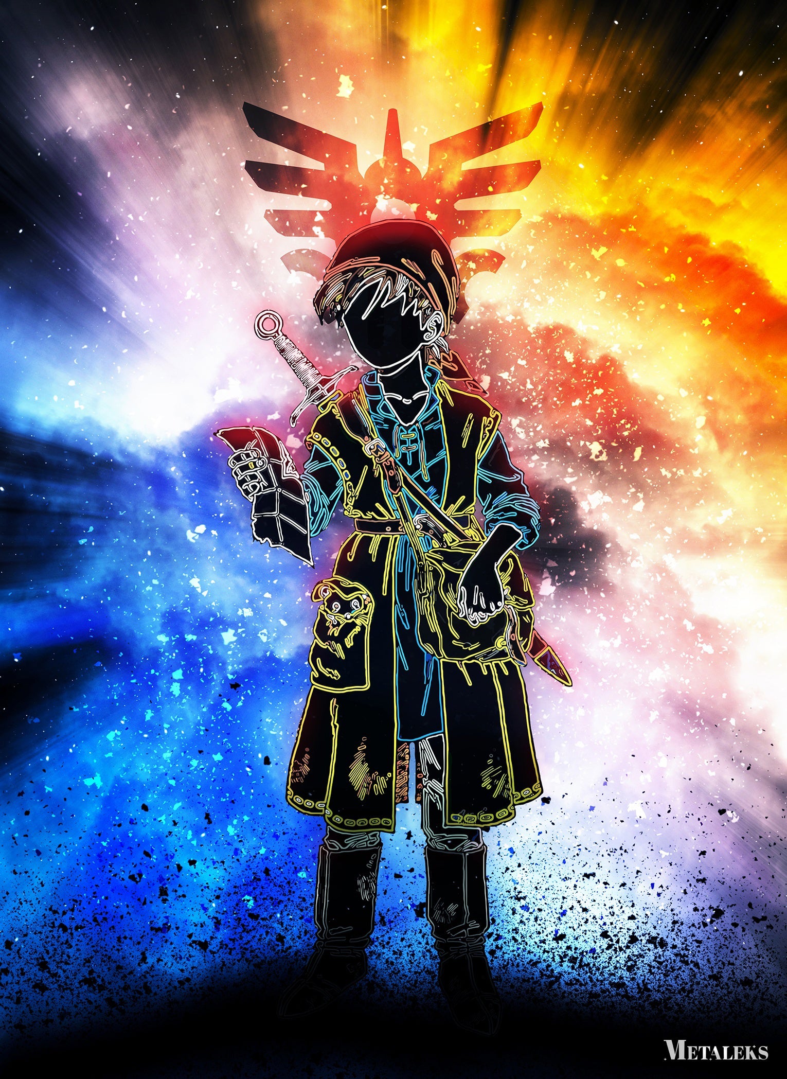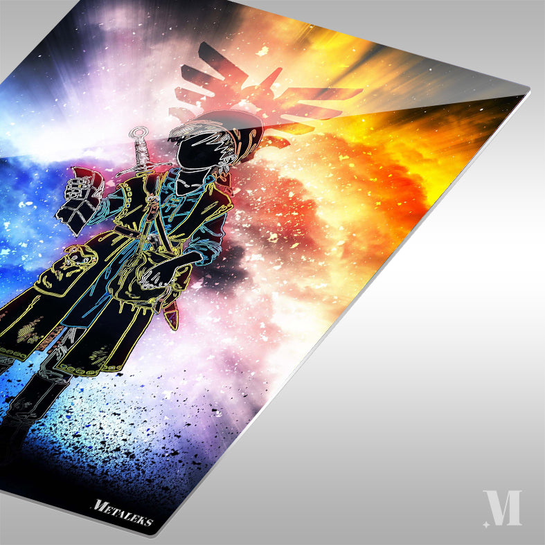 Link from “The Legend of Zelda” holds a sword and a shield, wearing a tunic and a hat, with a Triforce symbol in the background. Metaleks Ultra HD Metal Poster – Create Your Passionate Space.