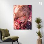 A character with long blonde hair, wearing a dark outfit, has sharp teeth and glowing yellow eyes. Metaleks Ultra HD Metal Poster – Create Your Passionate Space.