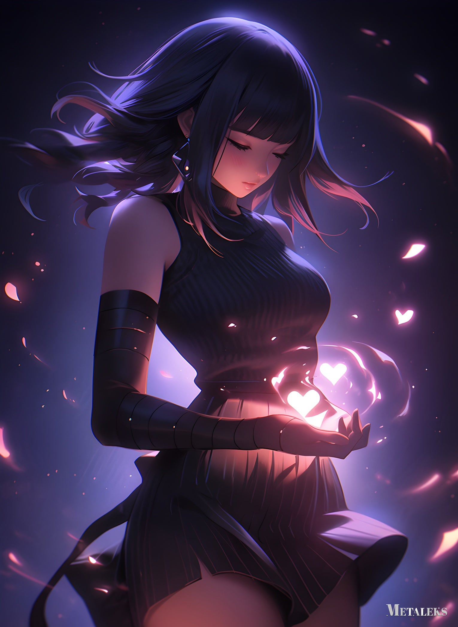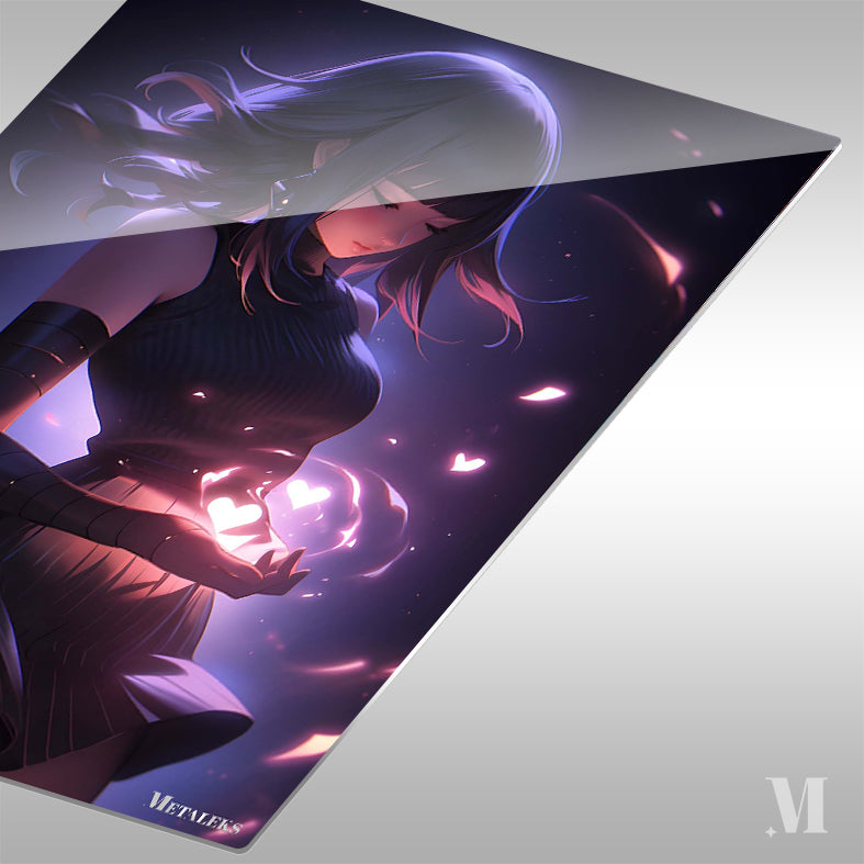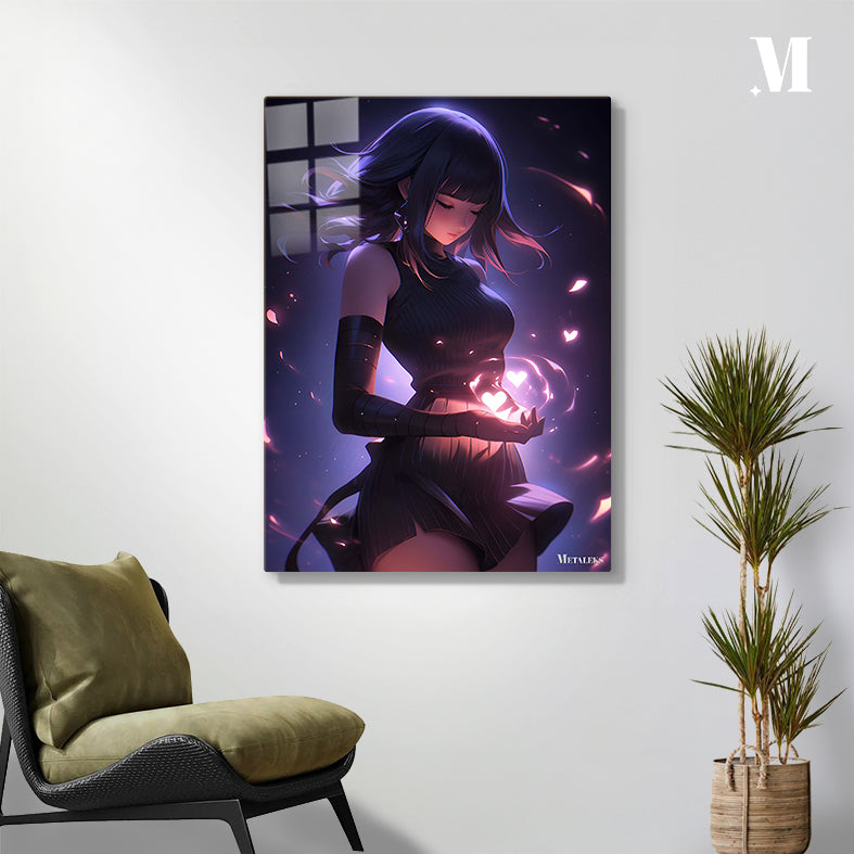 A girl with long dark hair and a sleeveless dress is holding glowing heart-shaped lights in her hands. Metaleks Ultra HD Metal Poster – Create Your Passionate Space.