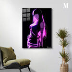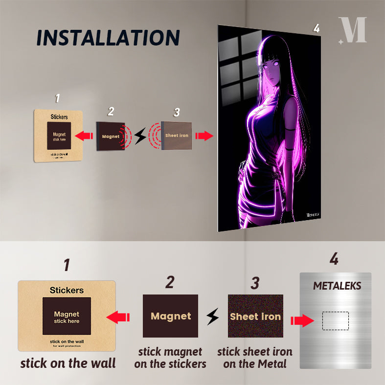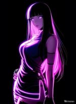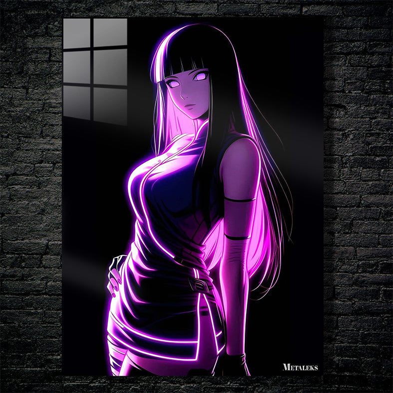 Hinata Hyuga from the anime “Naruto” is depicted with long black hair and a glowing purple outfit. Metaleks Ultra HD Metal Poster – Create Your Passionate Space.