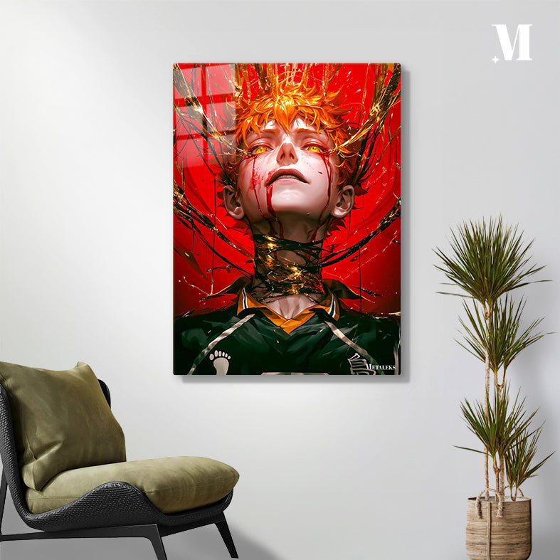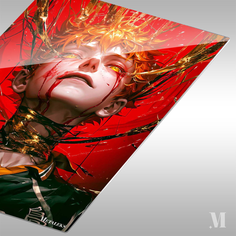 The image features a character with orange hair, wearing a black and yellow sports jersey. The character has a distressed expression with blood streaming from their eyes and mouth. The background is predominantly red with golden and black splashes, adding to the dramatic effect. Metaleks Ultra HD Metal Poster – Create Your Passionate Space.