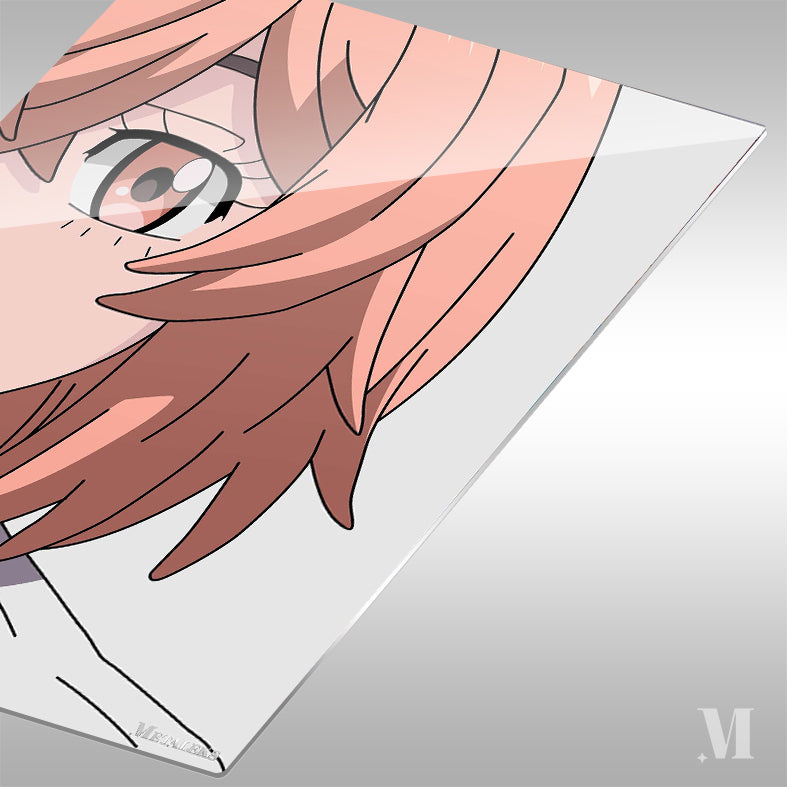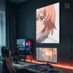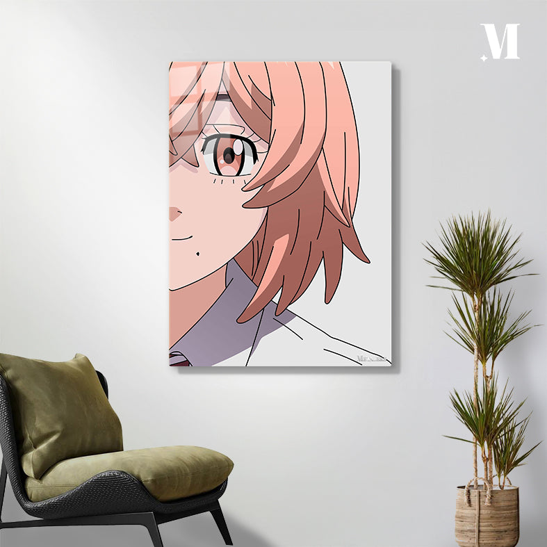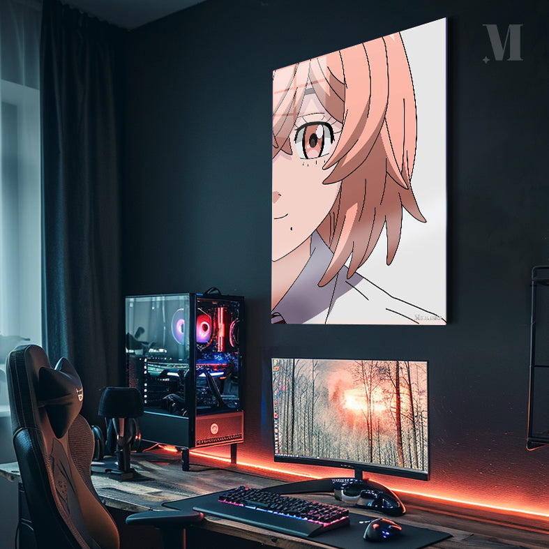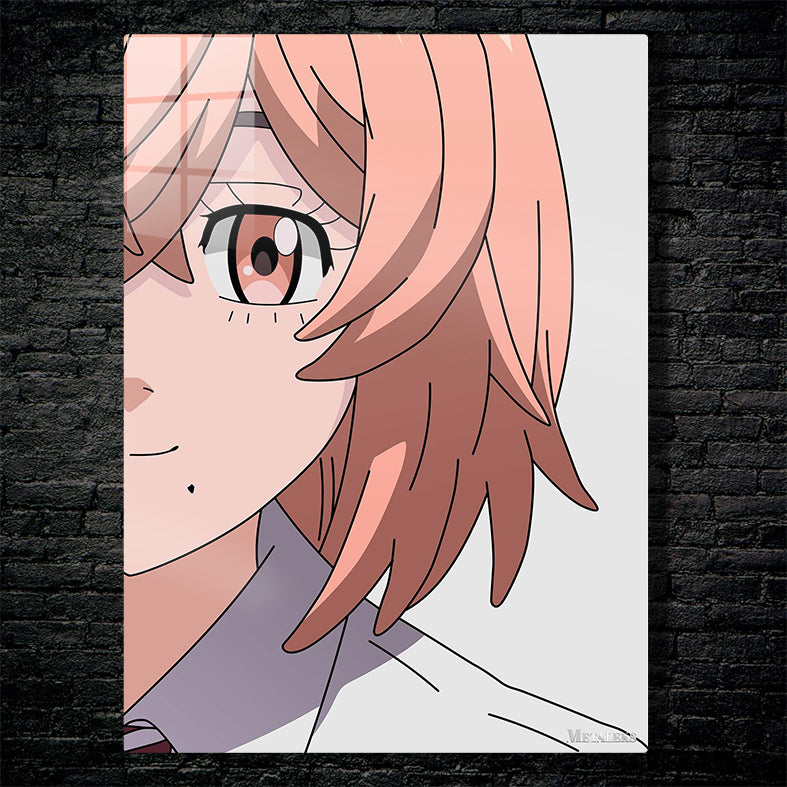 A person with light pink hair and an eye with a red iris. Metaleks Ultra HD Metal Poster – Create Your Passionate Space.