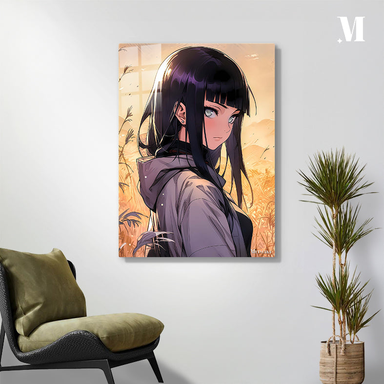 A girl with long black hair and bangs, wearing a hooded jacket, stands in a field with tall grass. She has light blue eyes and an earring in her left ear. Metaleks Ultra HD Metal Poster – Create Your Passionate Space.