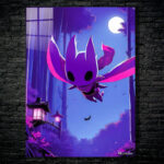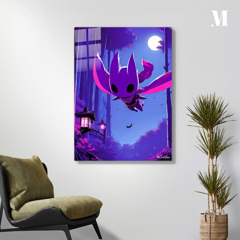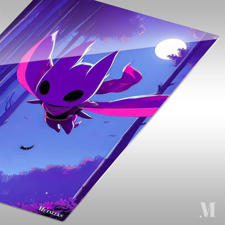 A purple, bat-like creature with large ears and a flowing cape is flying under a full moon. Metaleks Ultra HD Metal Poster – Create Your Passionate Space.