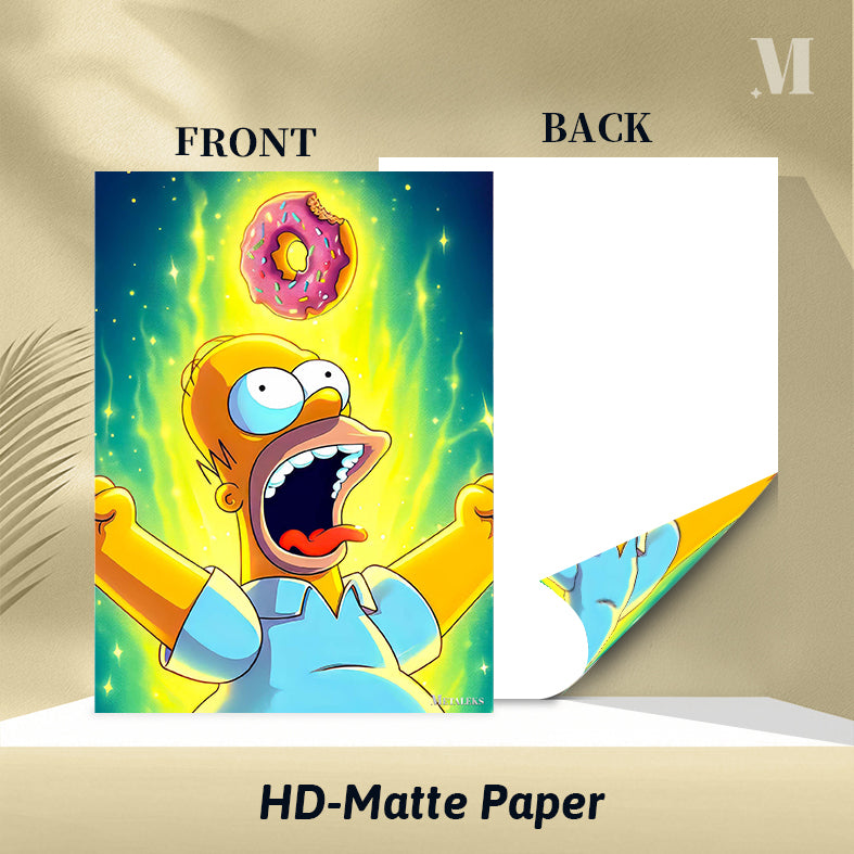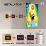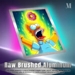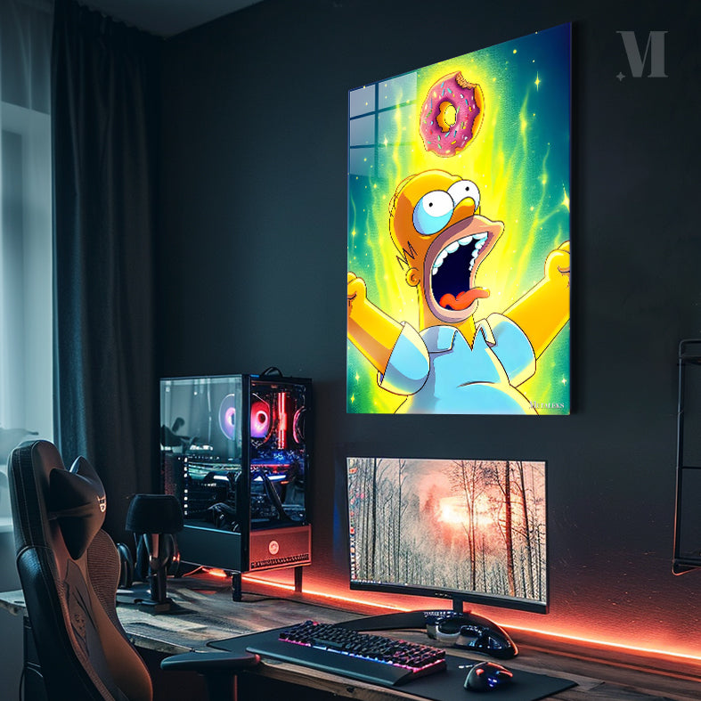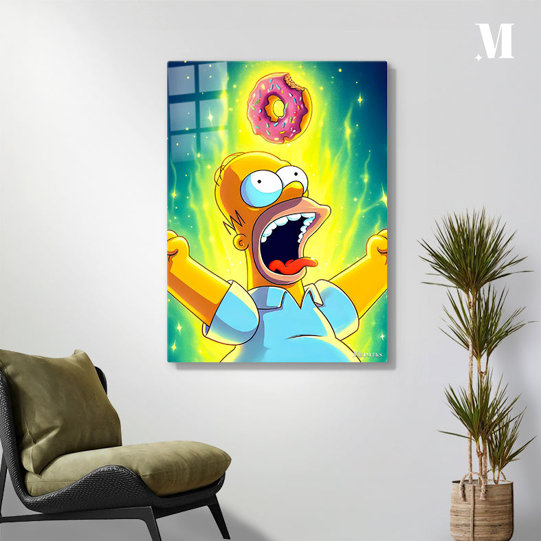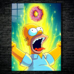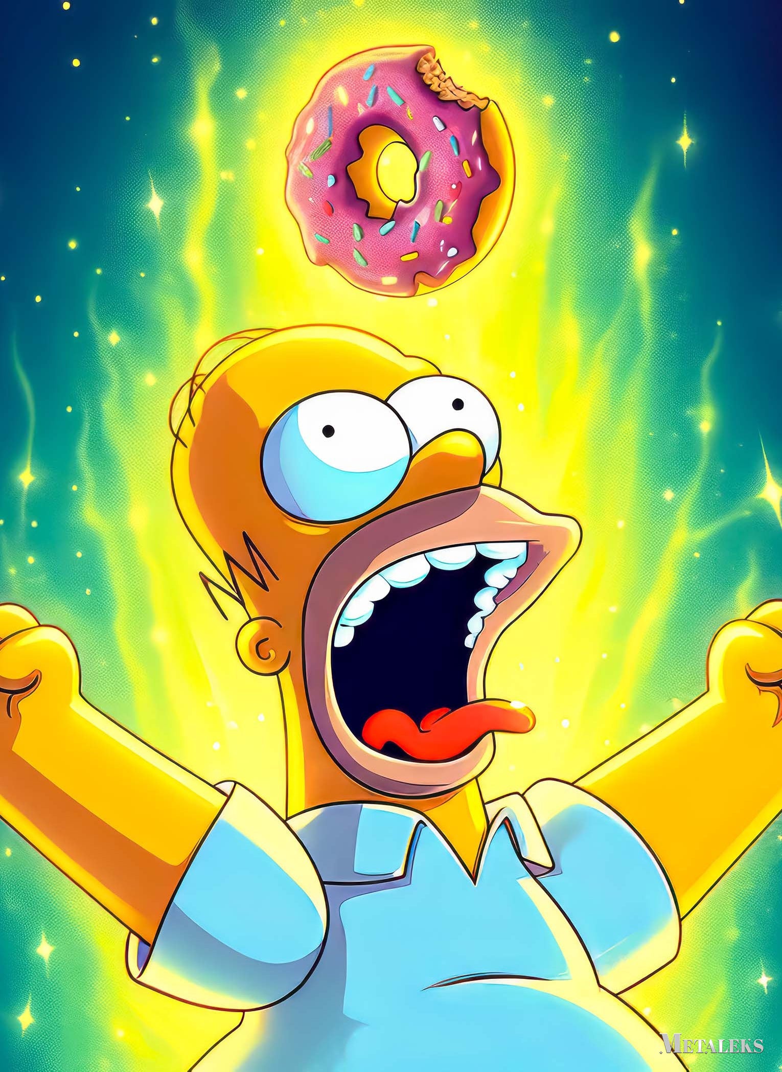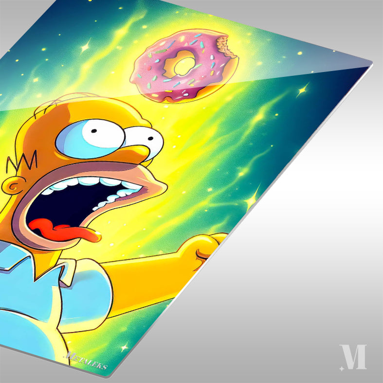 Homer Simpson from “The Simpsons” looks up at a pink frosted donut with sprinkles, his mouth wide open in anticipation. Metaleks Ultra HD Metal Poster – Create Your Passionate Space.