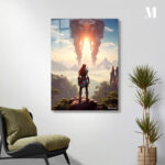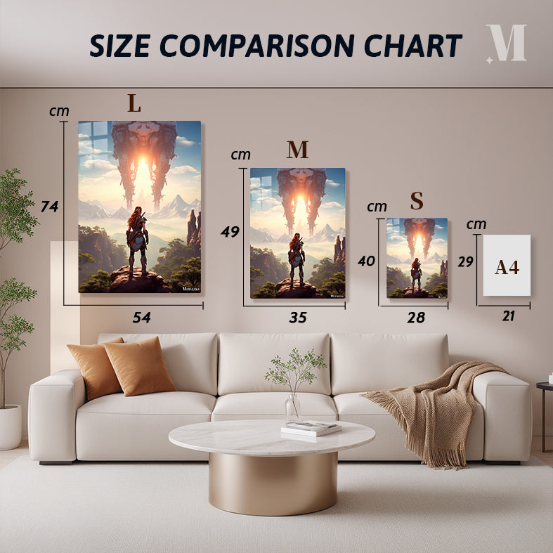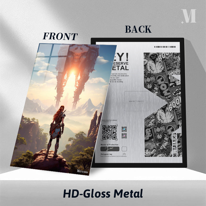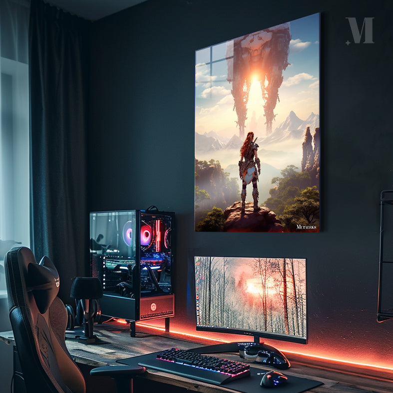 Aloy from “Horizon Zero Dawn” stands on a rocky outcrop, facing a massive mechanical structure in the distance. Metaleks Ultra HD Metal Poster – Create Your Passionate Space.