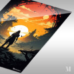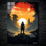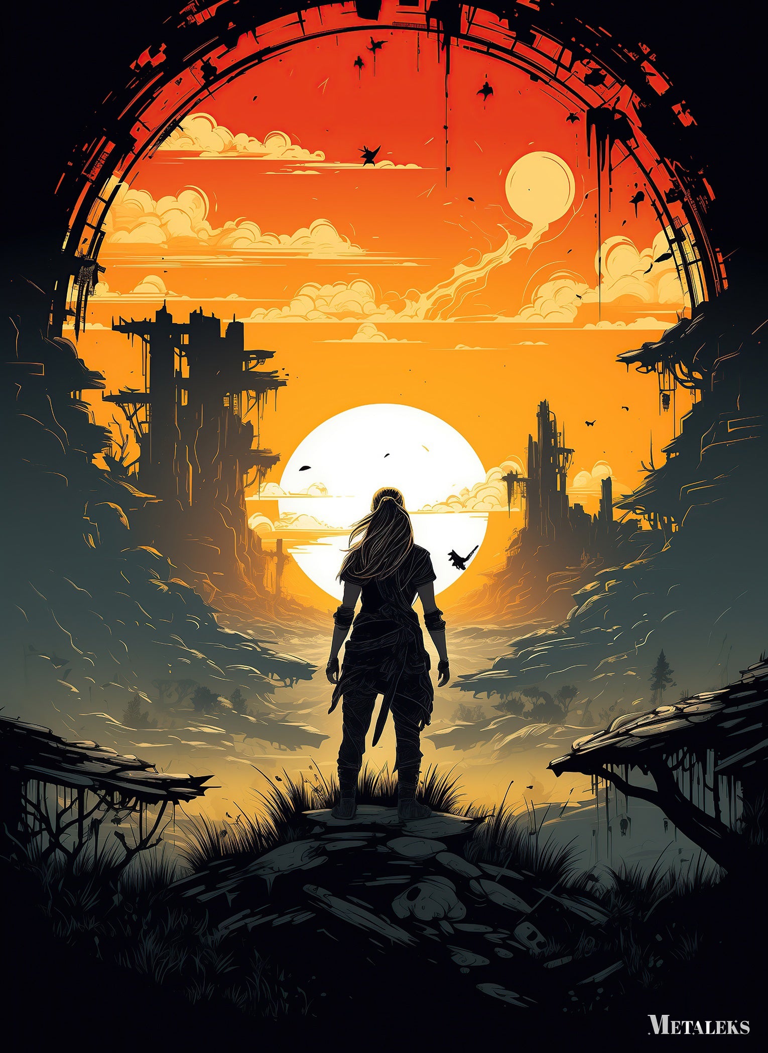 A person with long hair stands in a desolate, post-apocalyptic landscape. The scene is framed by an archway, and the sky is filled with a large, glowing sun. The person is facing away from the viewer, looking out over the ruins. Metaleks Ultra HD Metal Poster – Create Your Passionate Space.