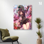 A girl with long dark hair, wearing a green hat adorned with flowers, a dark green and black outfit with intricate designs, and holding a staff. She has red eyes and is wearing a red bead bracelet on her wrist. Metaleks Ultra HD Metal Poster – Create Your Passionate Space.