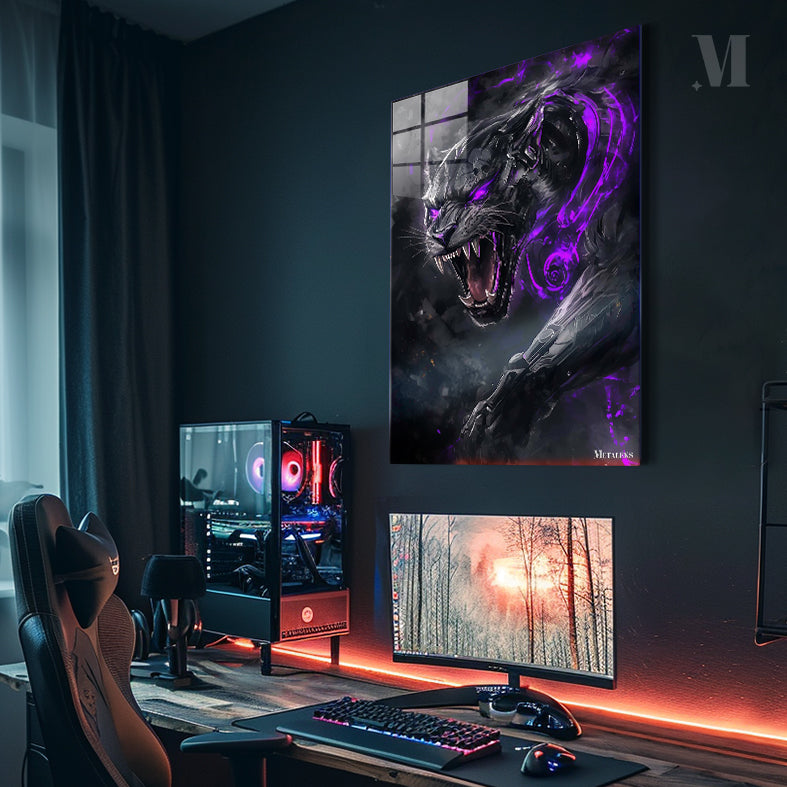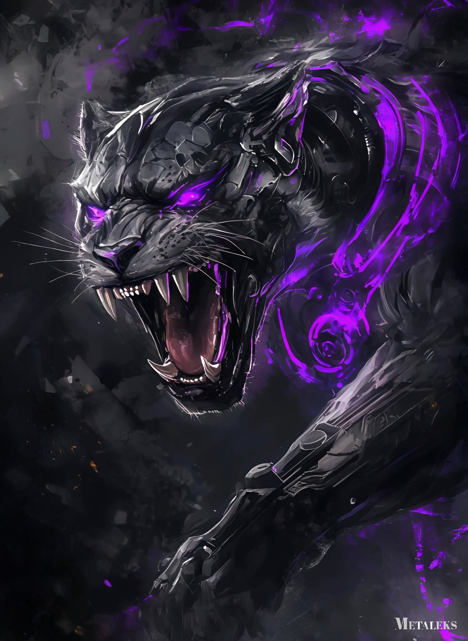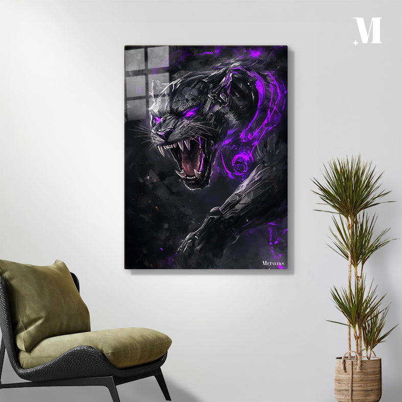 A black panther with glowing purple eyes and accents is roaring.