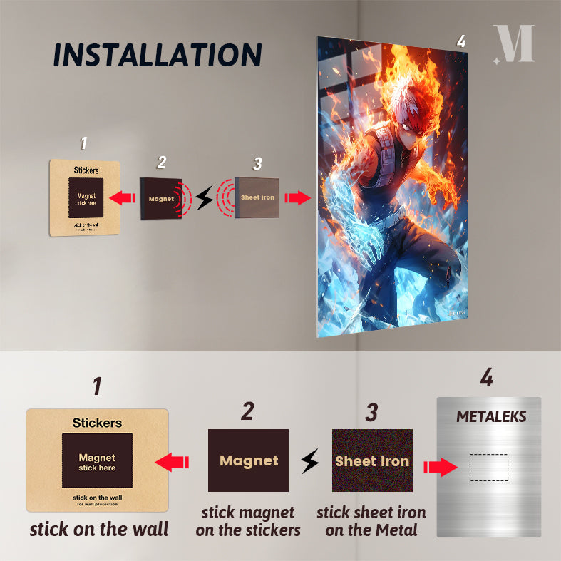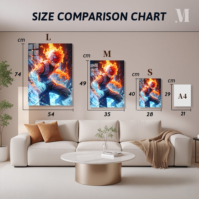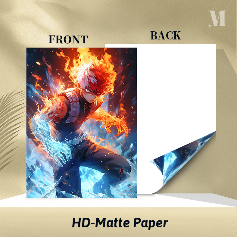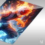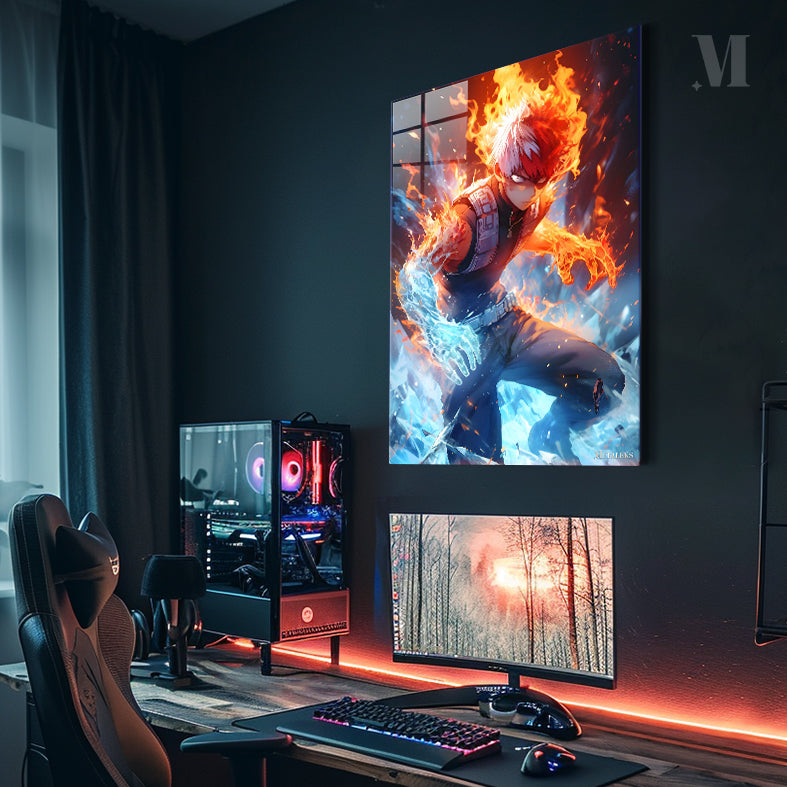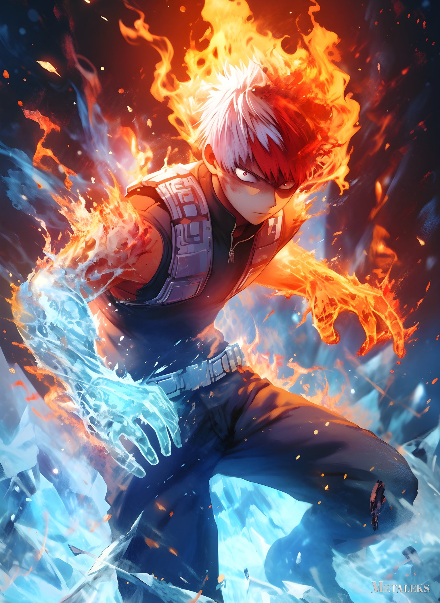 Shoto Todoroki from “My Hero Academia” is depicted with flames on his right side and ice on his left side. His hair is half white and half red, and he is wearing a tactical vest. Metaleks Ultra HD Metal Poster – Create Your Passionate Space.