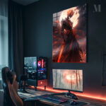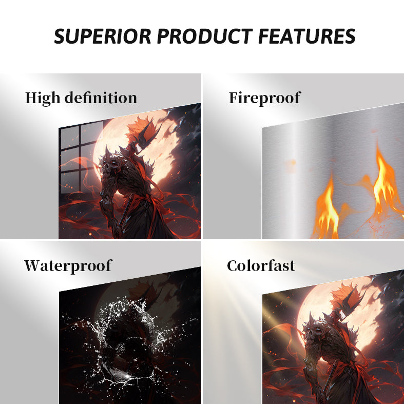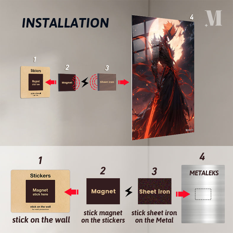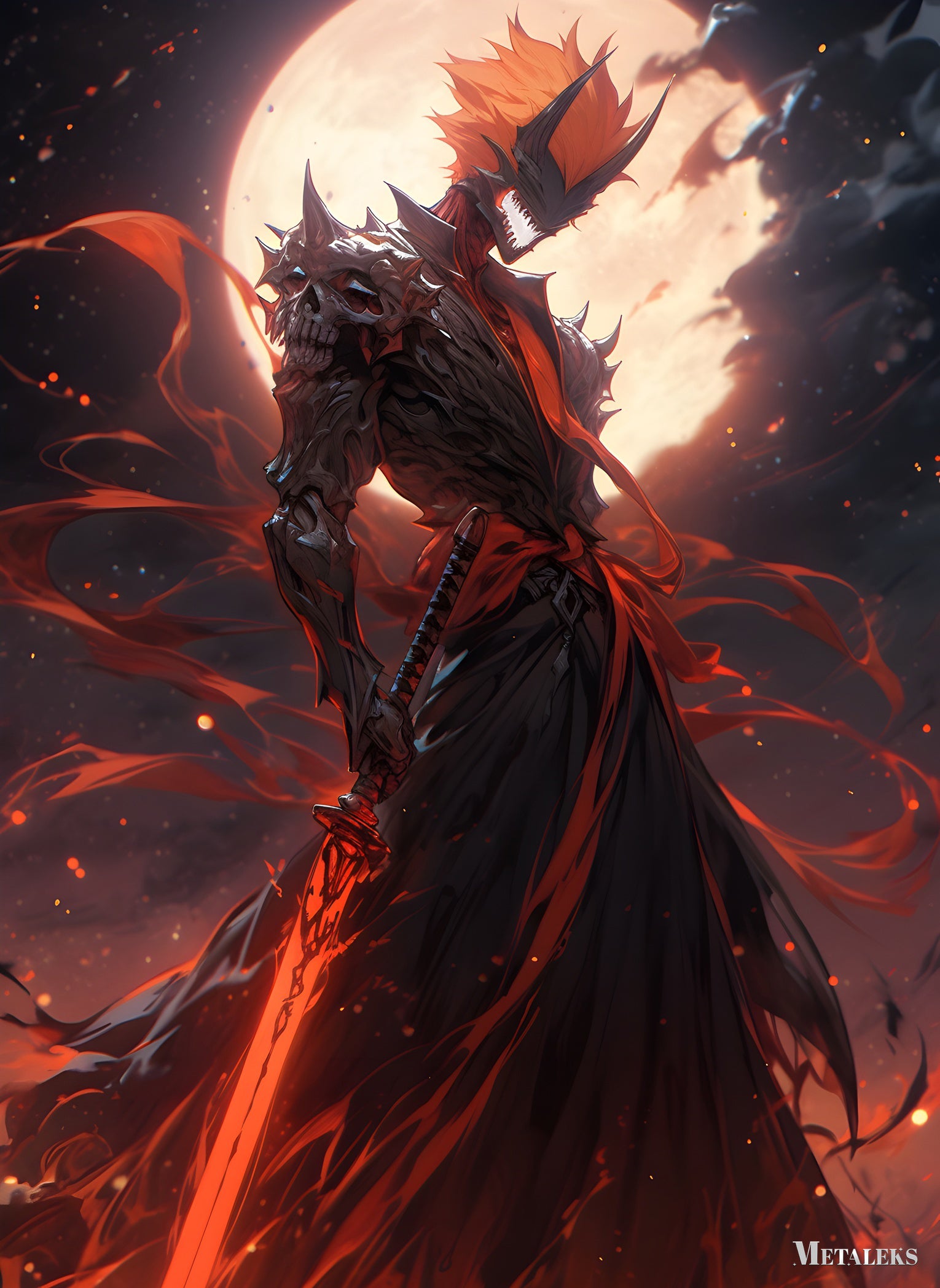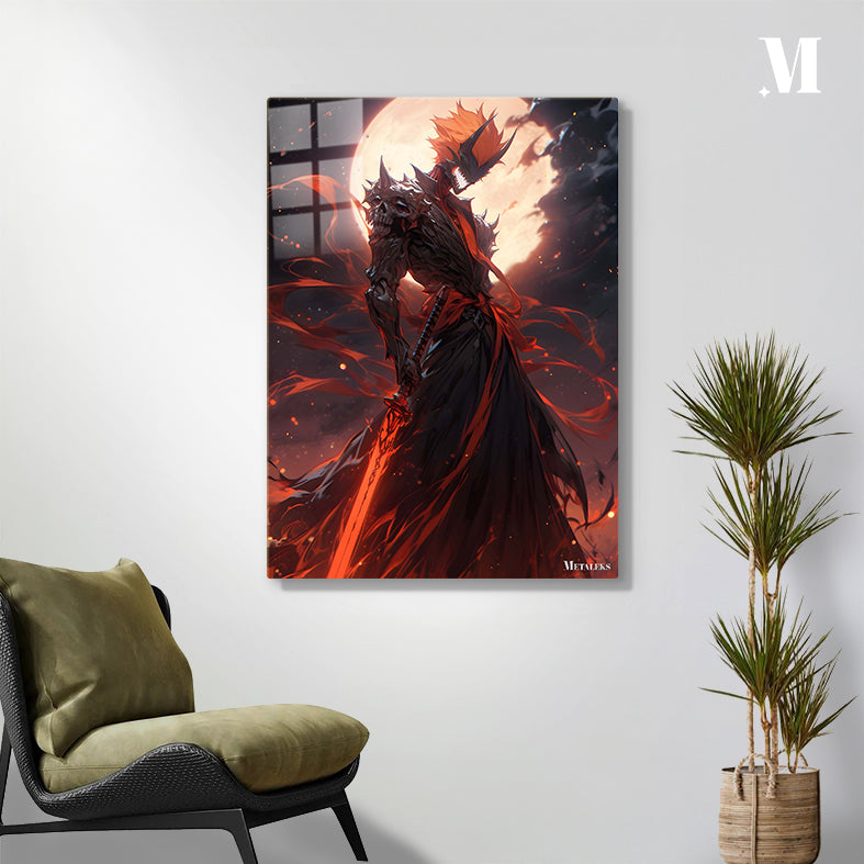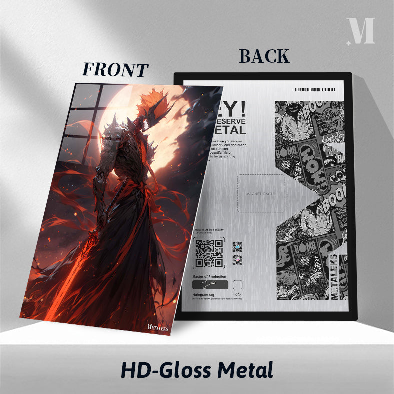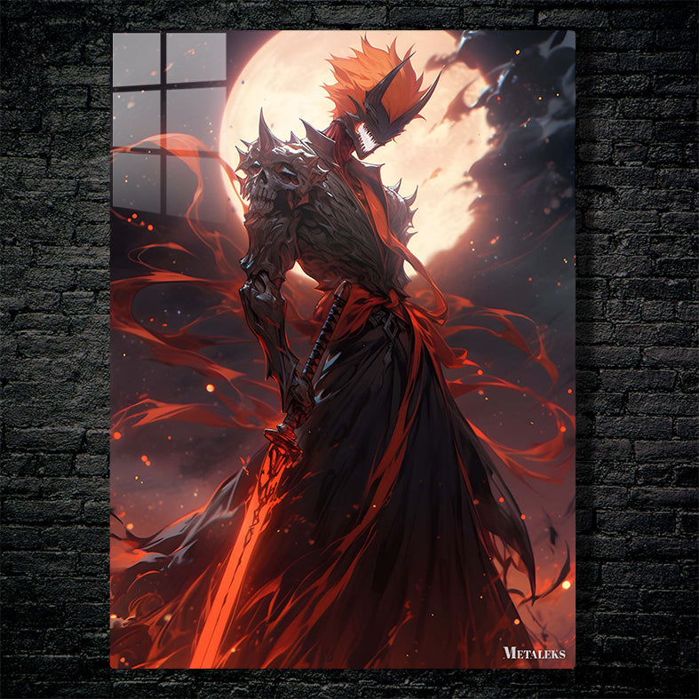 A menacing figure clad in dark, spiked armor with a skull-like helmet. The figure wields a large, glowing red sword and has a fiery, menacing presence. Metaleks Ultra HD Metal Poster – Create Your Passionate Space.
