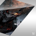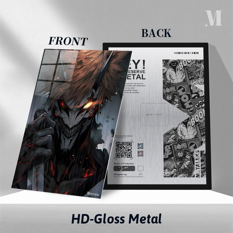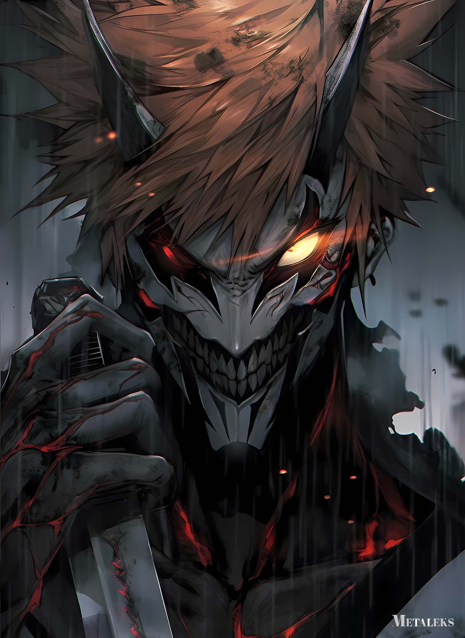 A character with spiky hair and glowing eyes, resembling a demon or monster, holds a weapon. Metaleks Ultra HD Metal Poster – Create Your Passionate Space.