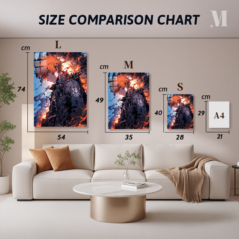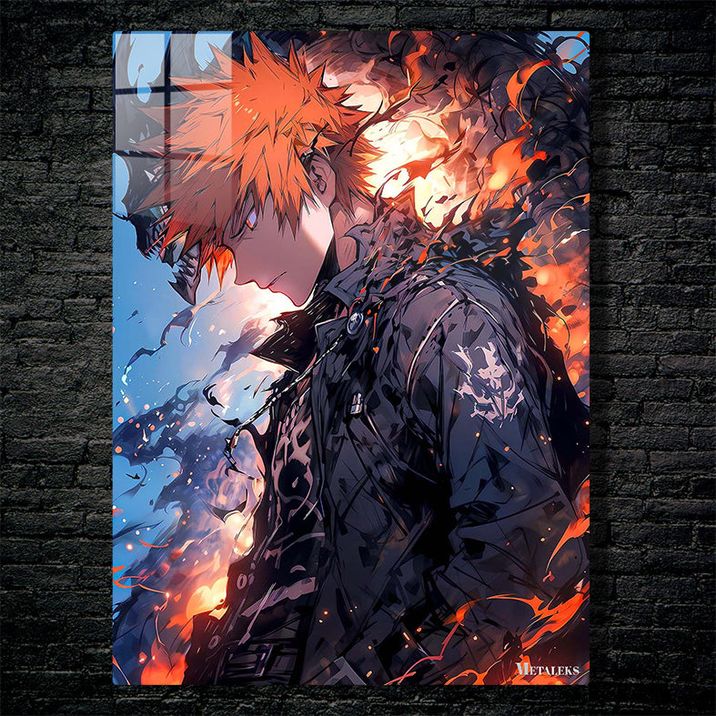 Itadori Yuji from “Jujutsu Kaisen” has orange spiky hair and is wearing a black jacket. Metaleks Ultra HD Metal Poster – Create Your Passionate Space.