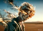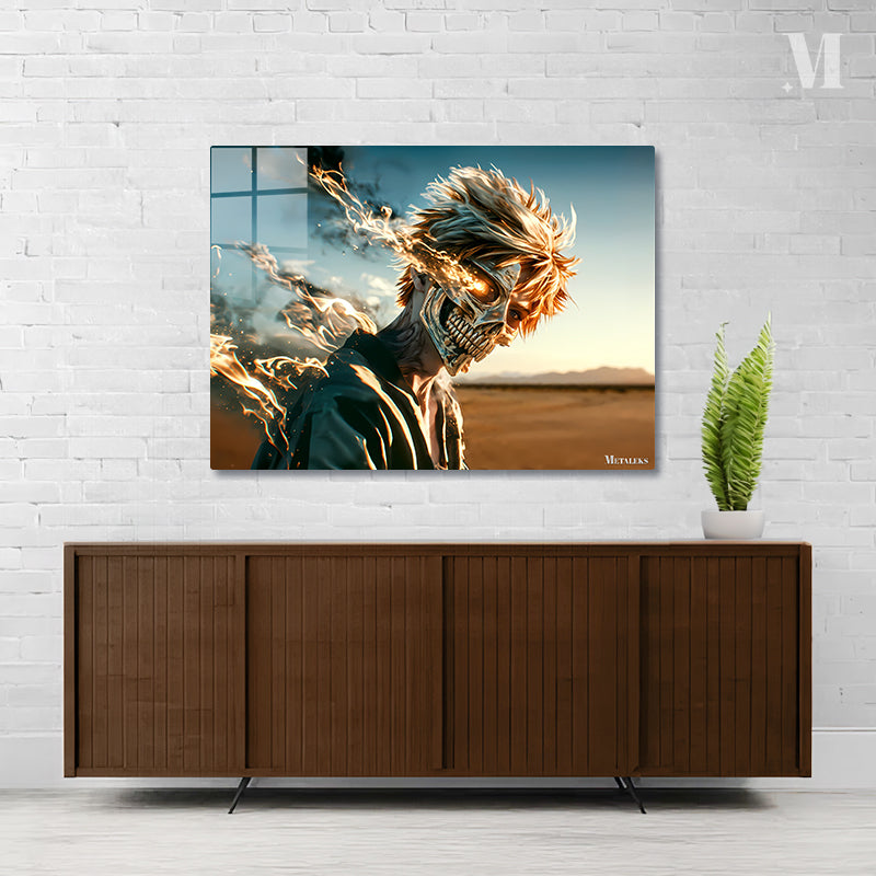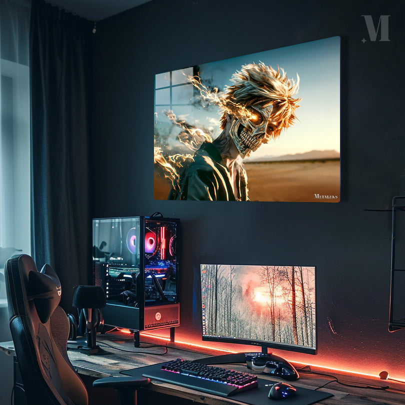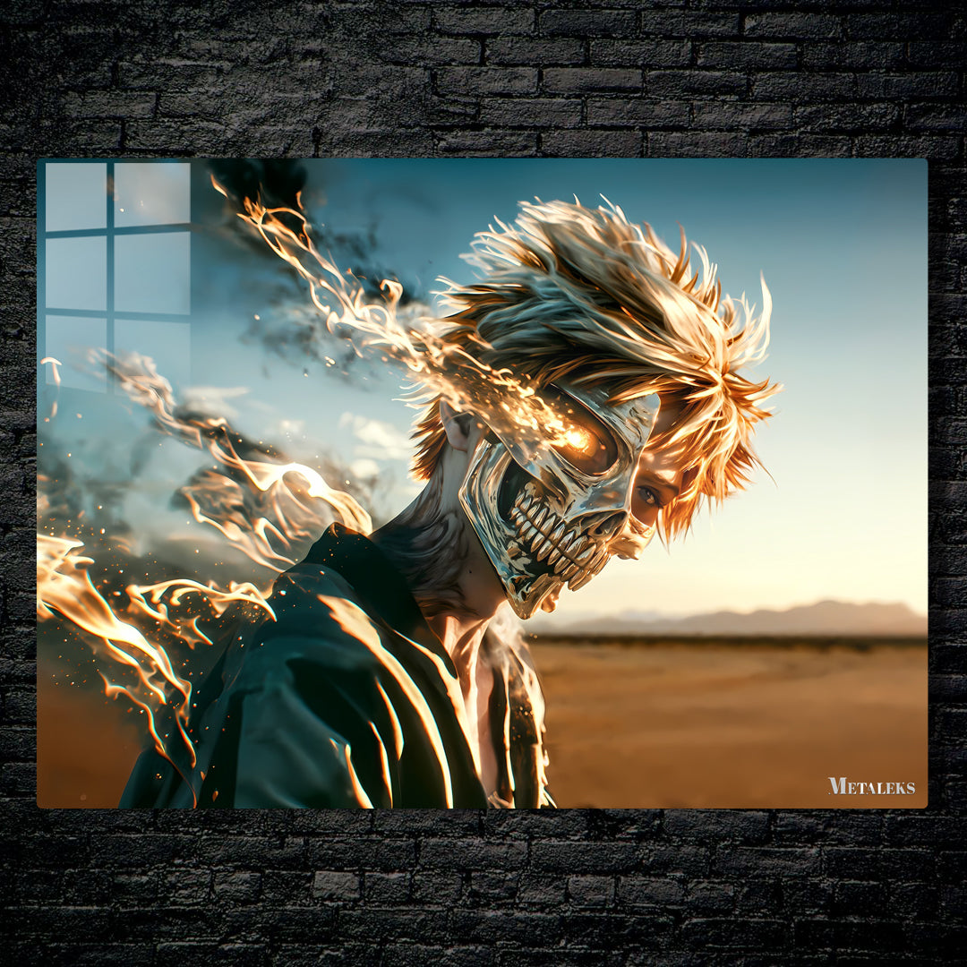 A character with spiky blonde hair, wearing a dark outfit, has a fiery, skeletal face with glowing eyes. Metaleks Ultra HD Metal Poster – Create Your Passionate Space.