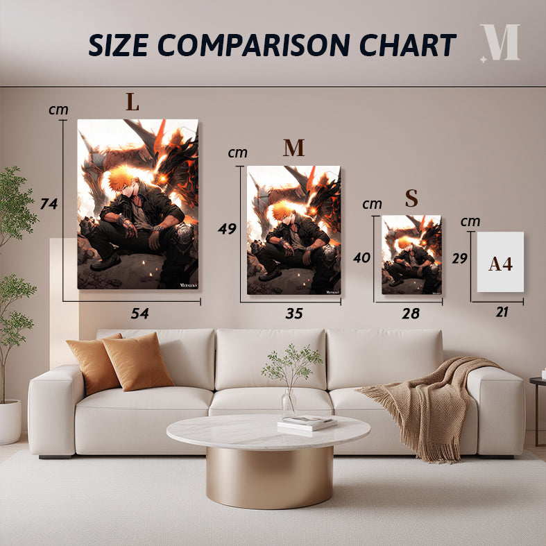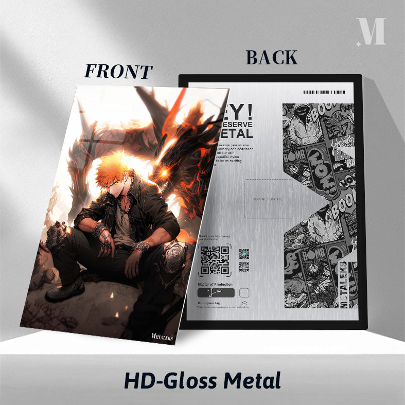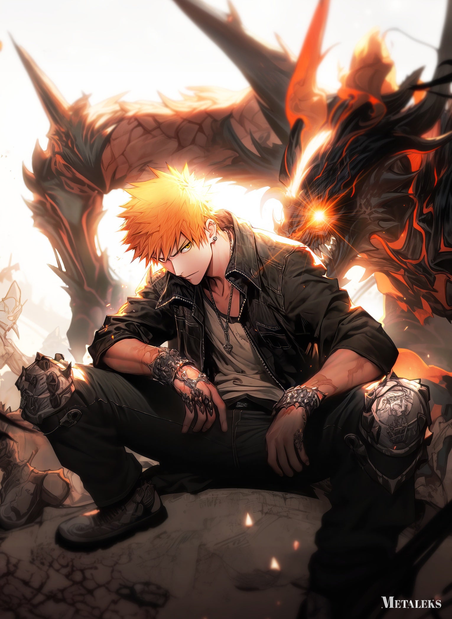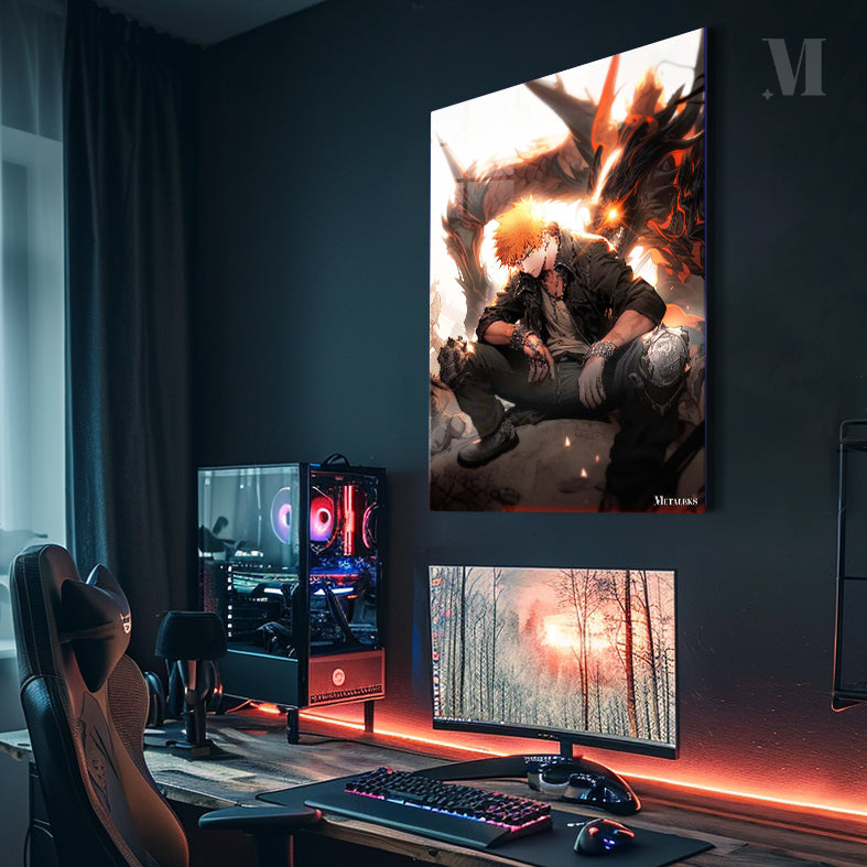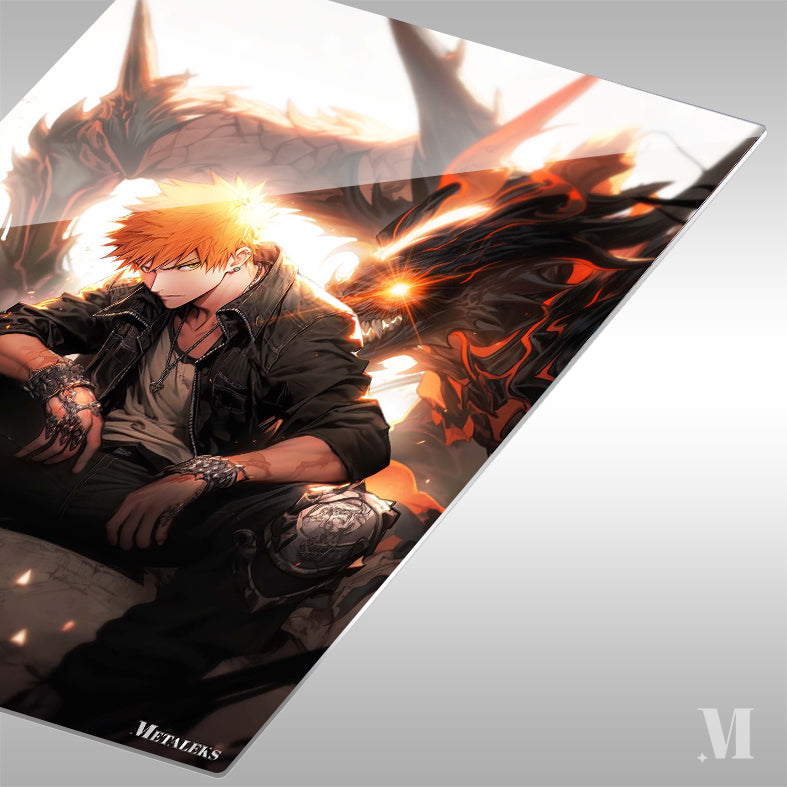 Ichigo Kurosaki from Bleach is sitting on the ground, wearing a black jacket, a white shirt, and black pants. He has orange hair and is wearing gloves and knee pads. Behind him is a large dragon with glowing eyes and flames. Metaleks Ultra HD Metal Poster – Create Your Passionate Space.