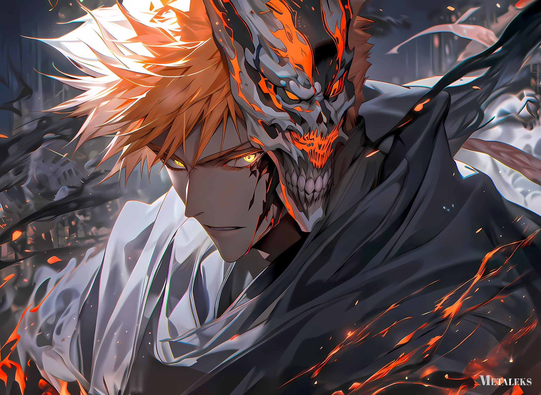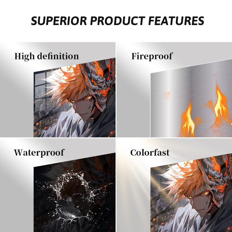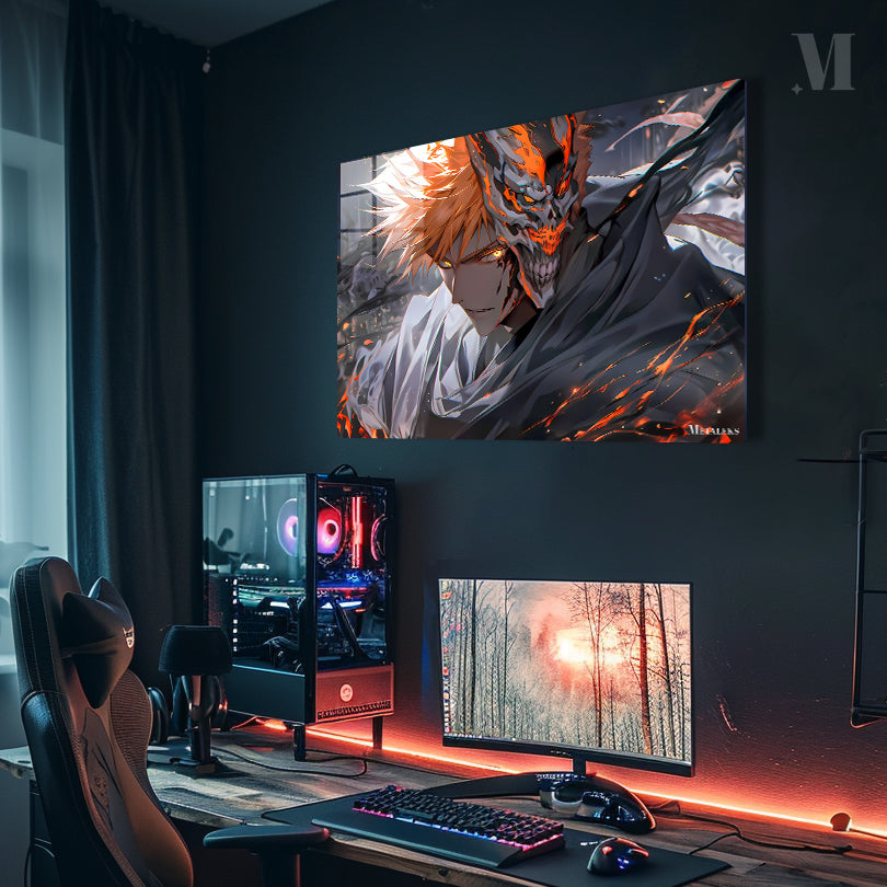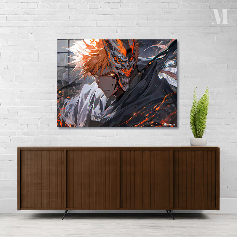 Ichigo Kurosaki from Bleach, with orange hair and a hollow mask on the right side of his face. Metaleks Ultra HD Metal Poster – Create Your Passionate Space.
