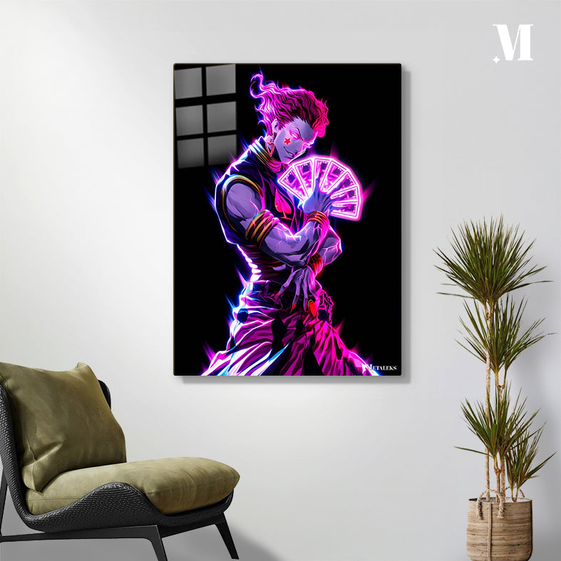 Hisoka from Hunter x Hunter is holding a fan of playing cards. He has pink hair and a red star on his cheek. His outfit is black with pink accents, and he has glowing effects around him. Metaleks Ultra HD Metal Poster – Create Your Passionate Space.