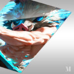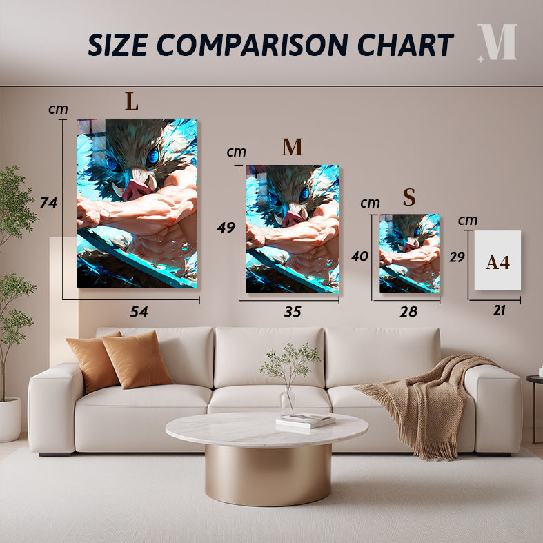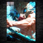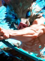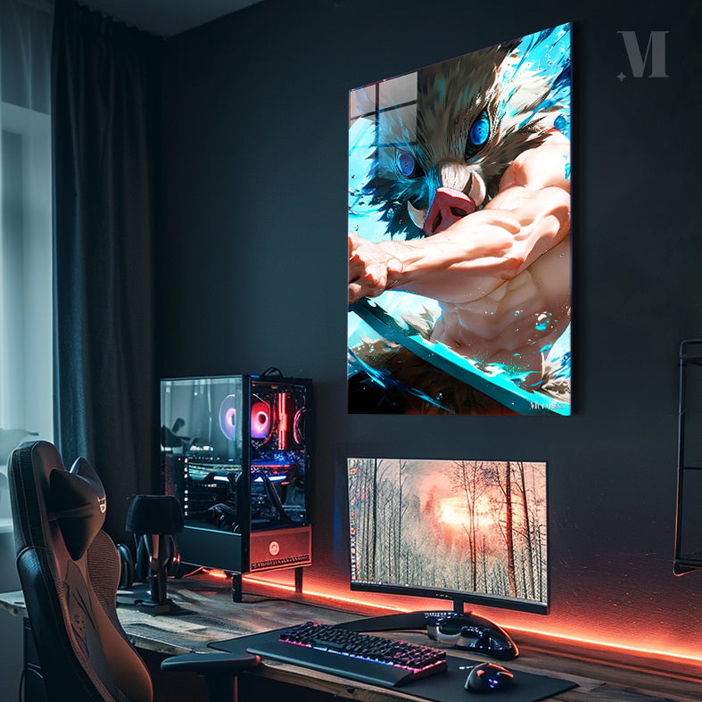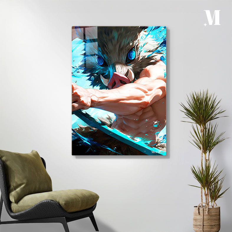 A muscular figure with a boar’s head, blue eyes, and tusks, holding a sword and surrounded by water splashes. Metaleks Ultra HD Metal Poster – Create Your Passionate Space.