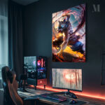 The subject is a muscular character with a boar-like mask, wielding a weapon, and surrounded by dynamic, fiery effects. Metaleks Ultra HD Metal Poster – Create Your Passionate Space.