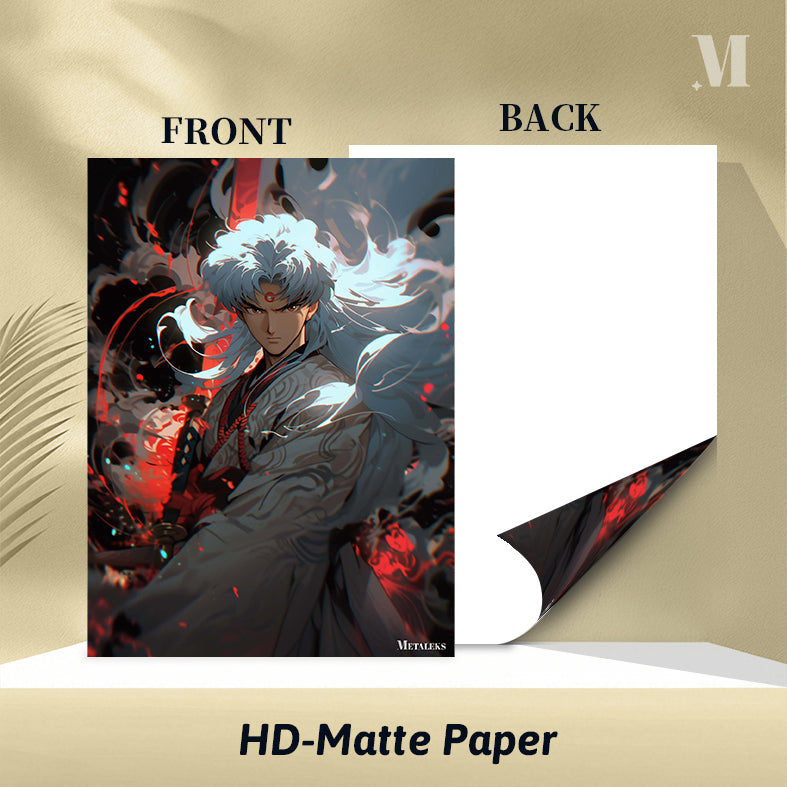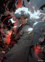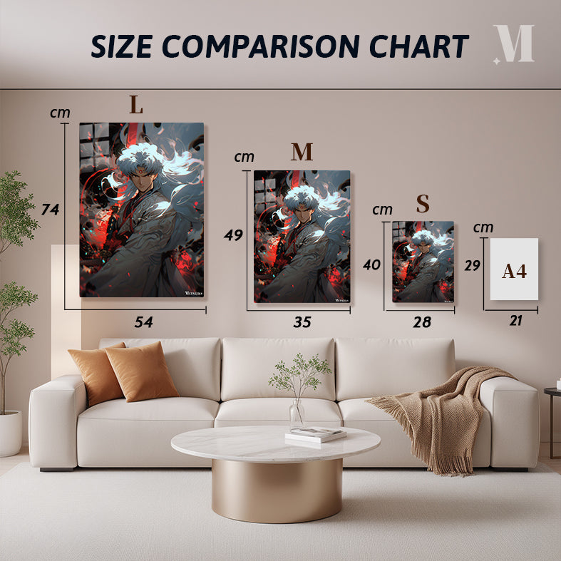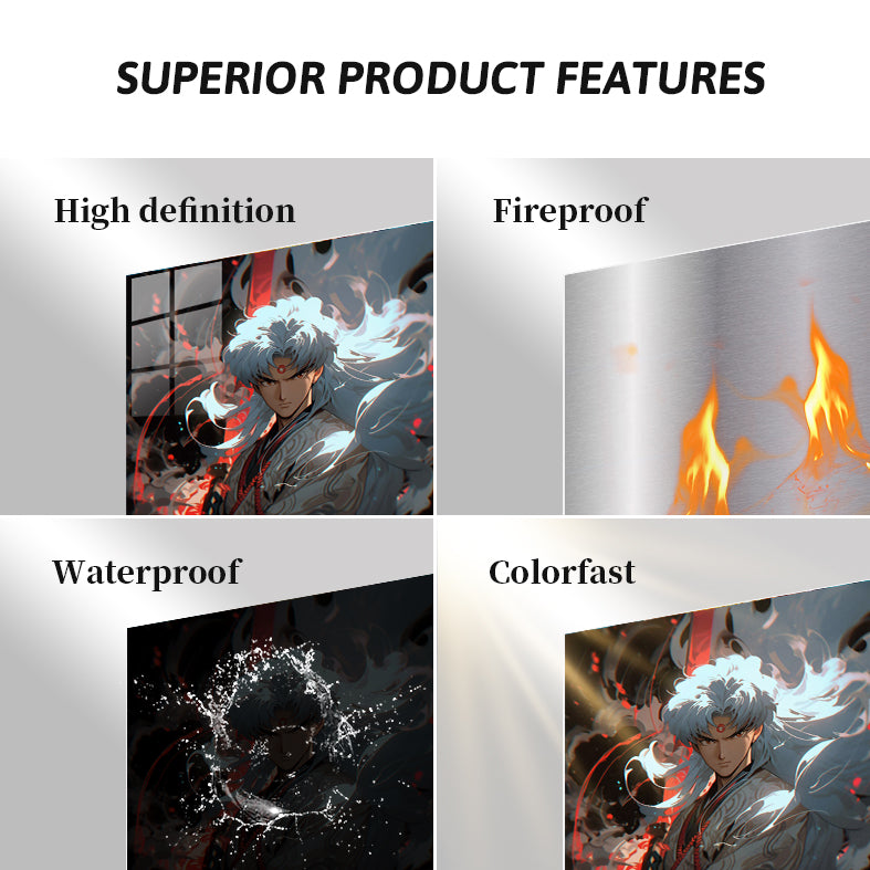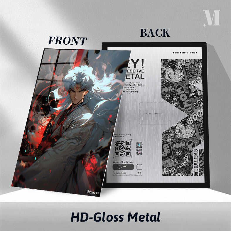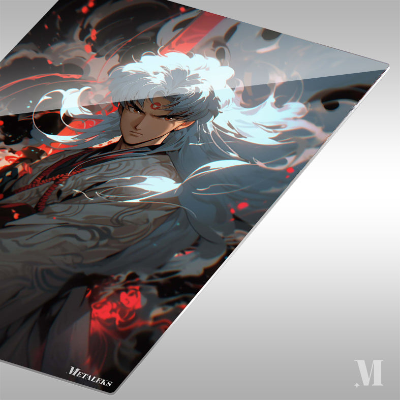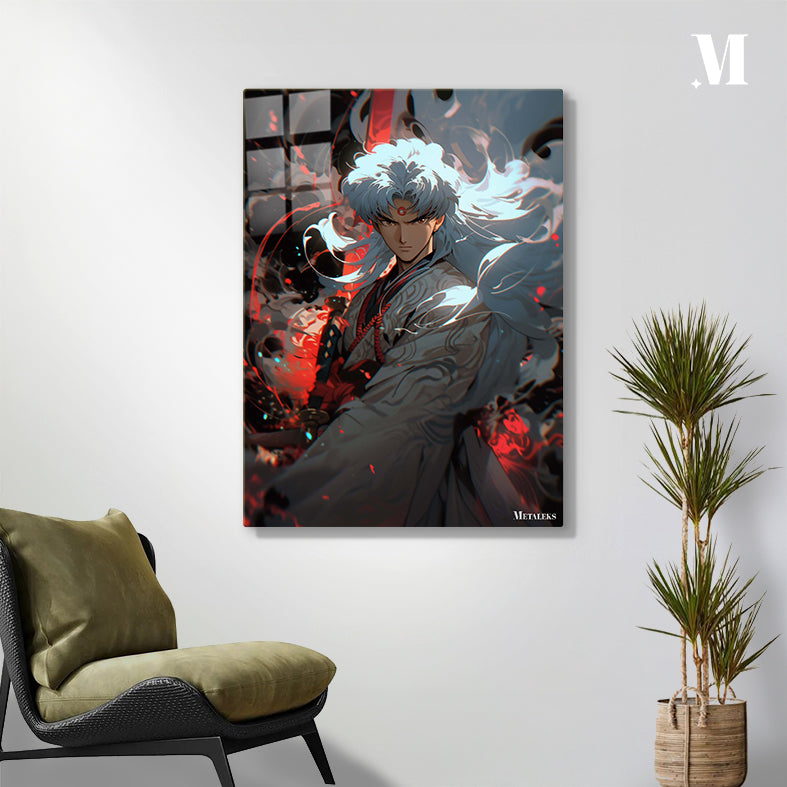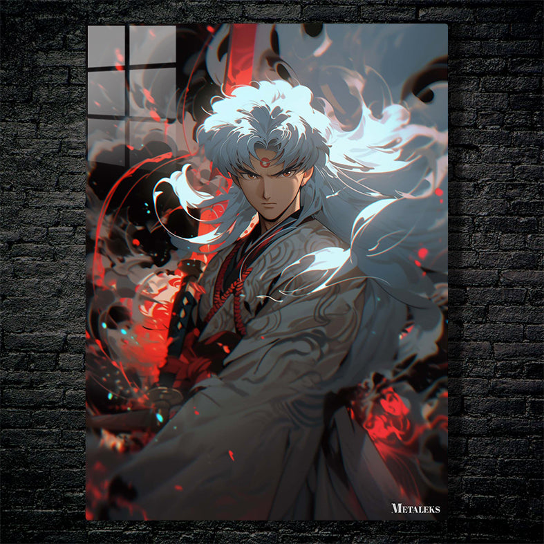 Inuyasha from the anime “Inuyasha” with long white hair and a traditional robe, holding a sword with a red and black hilt. Metaleks Ultra HD Metal Poster – Create Your Passionate Space.