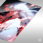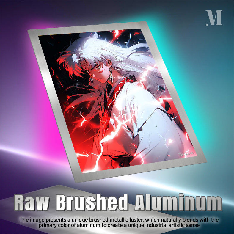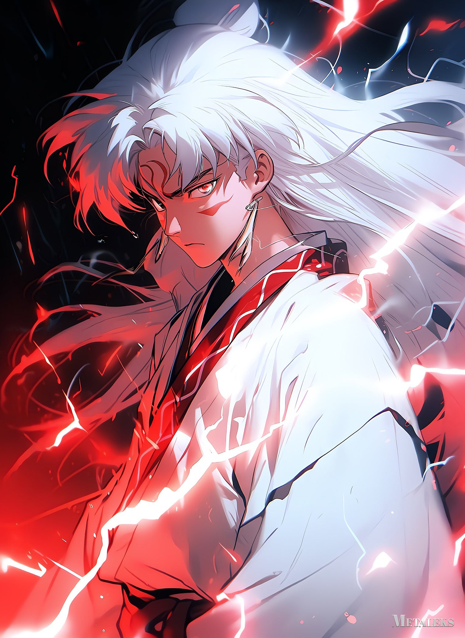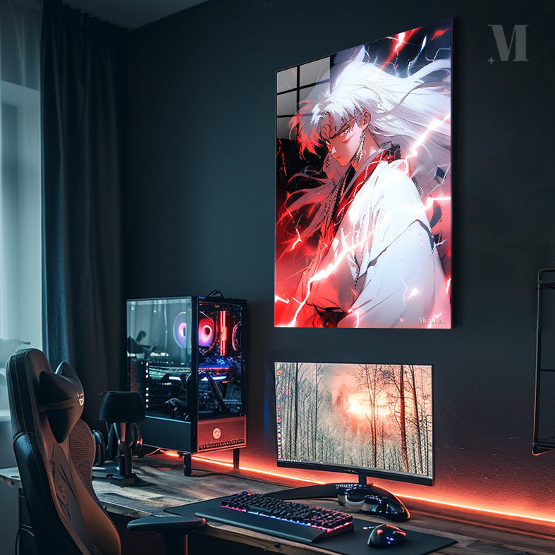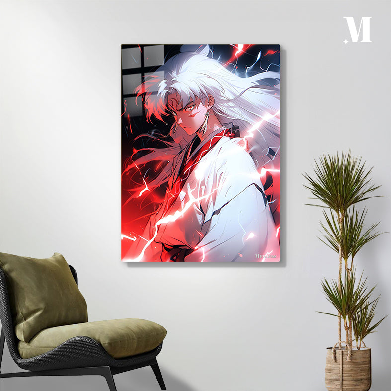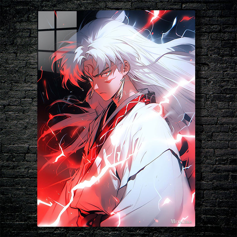 Inuyasha from the anime “Inuyasha” has long white hair, wears a white kimono with red accents, and is surrounded by red electric-like energy. Metaleks Ultra HD Metal Poster – Create Your Passionate Space.