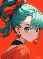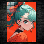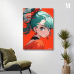 A girl with teal hair tied in a high ponytail with a red bow. She has large, expressive eyes and wears heart-shaped earrings. Metaleks Ultra HD Metal Poster – Create Your Passionate Space.