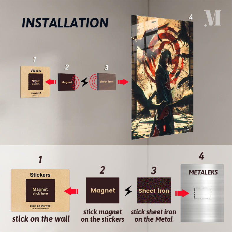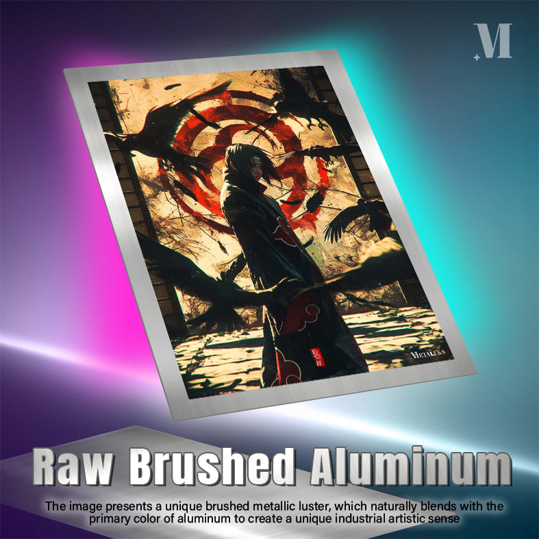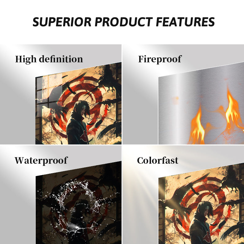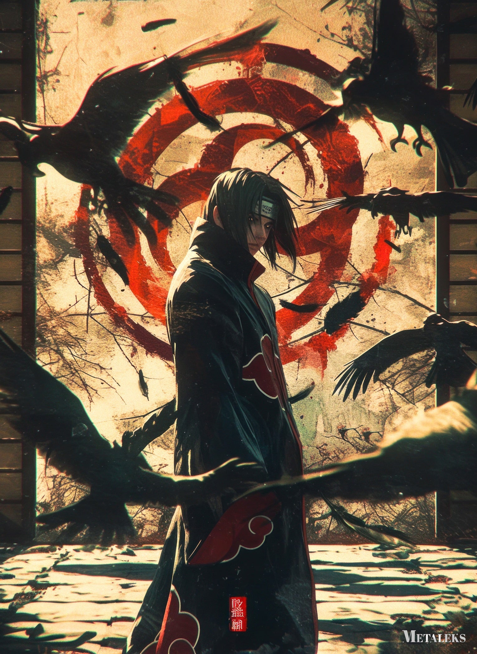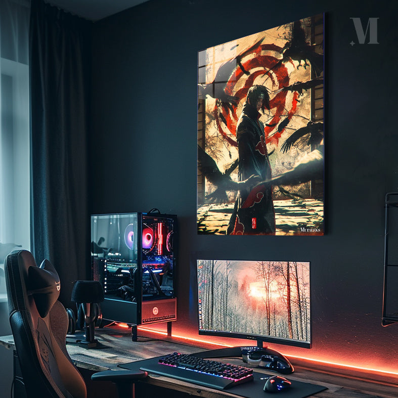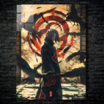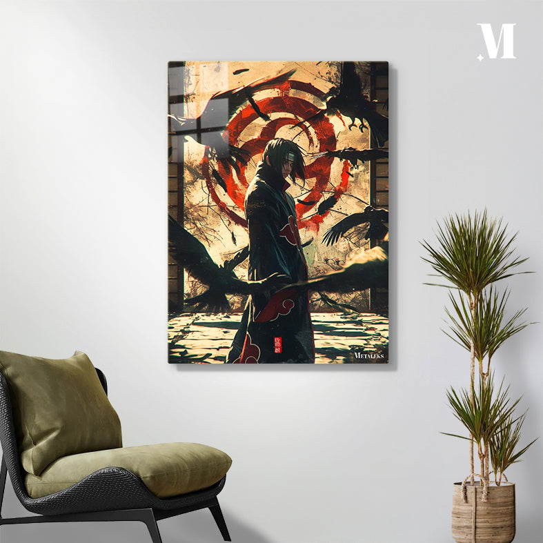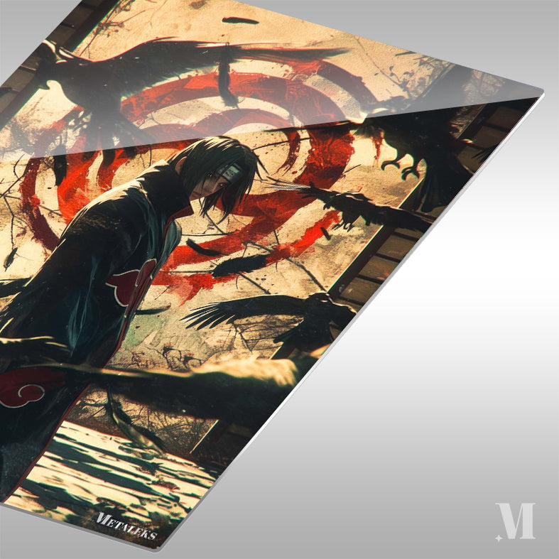 Itachi Uchiha from Naruto stands surrounded by crows, wearing a black cloak with red clouds. Metaleks Ultra HD Metal Poster – Create Your Passionate Space.