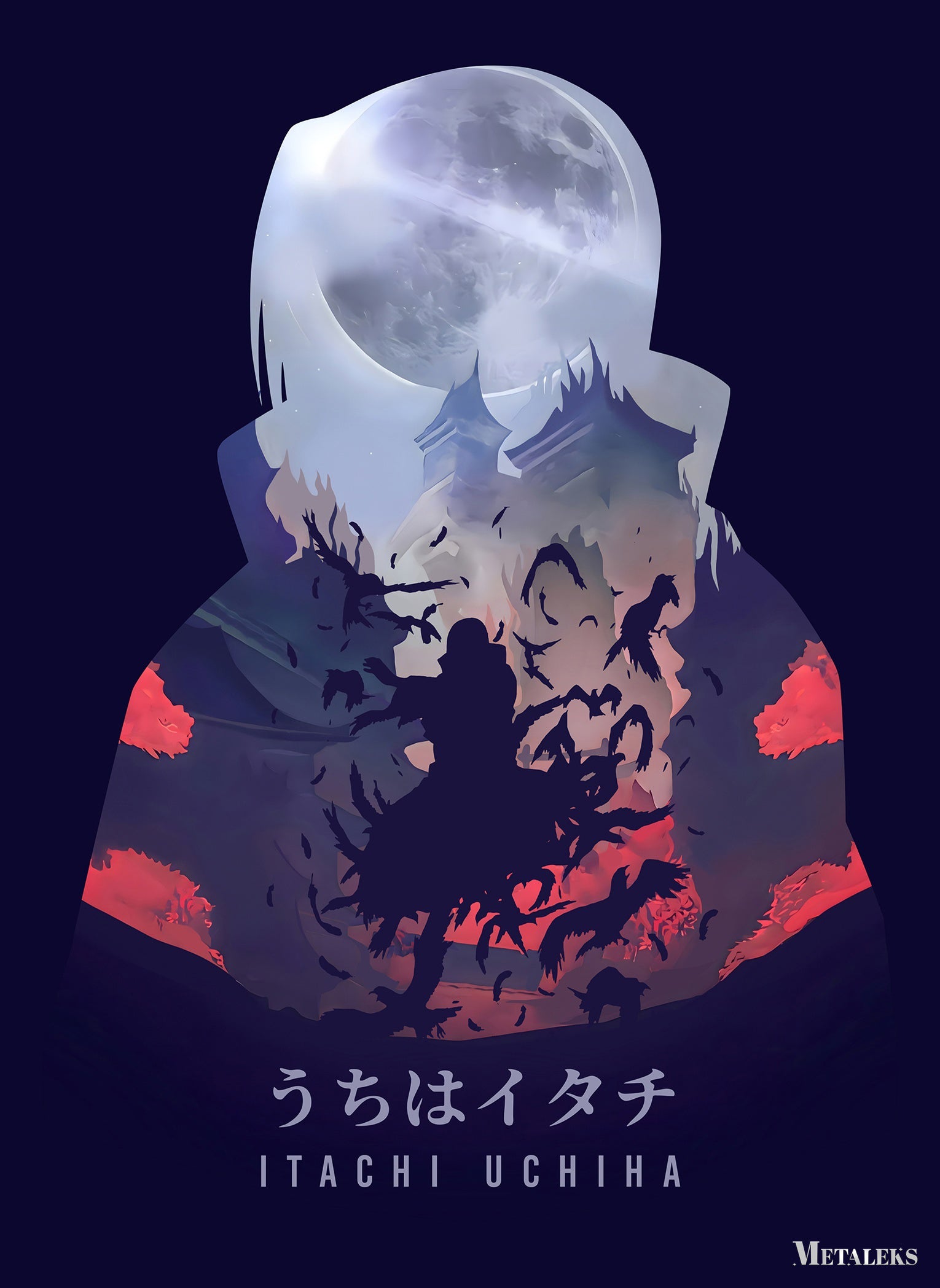 The image features a character with a hood, with a large moon behind their head. The lower part of the image shows a silhouette of a person surrounded by birds and a castle-like structure. The text at the bottom reads “うちはイタチ” (Itachi Uchiha). Metaleks Ultra HD Metal Poster – Create Your Passionate Space.