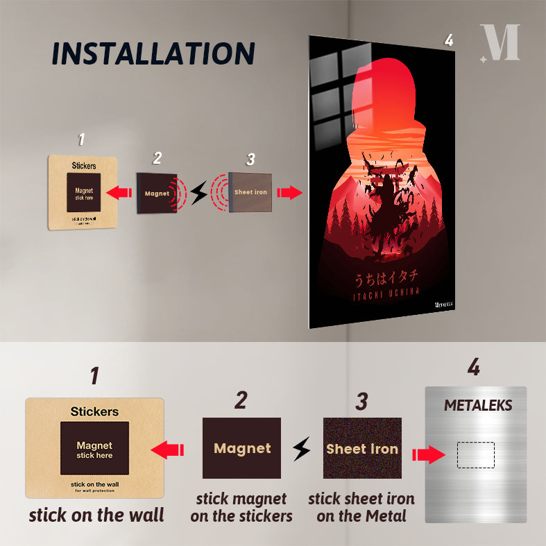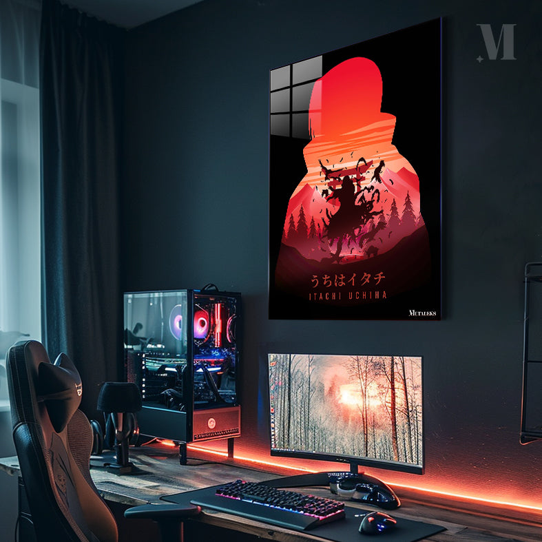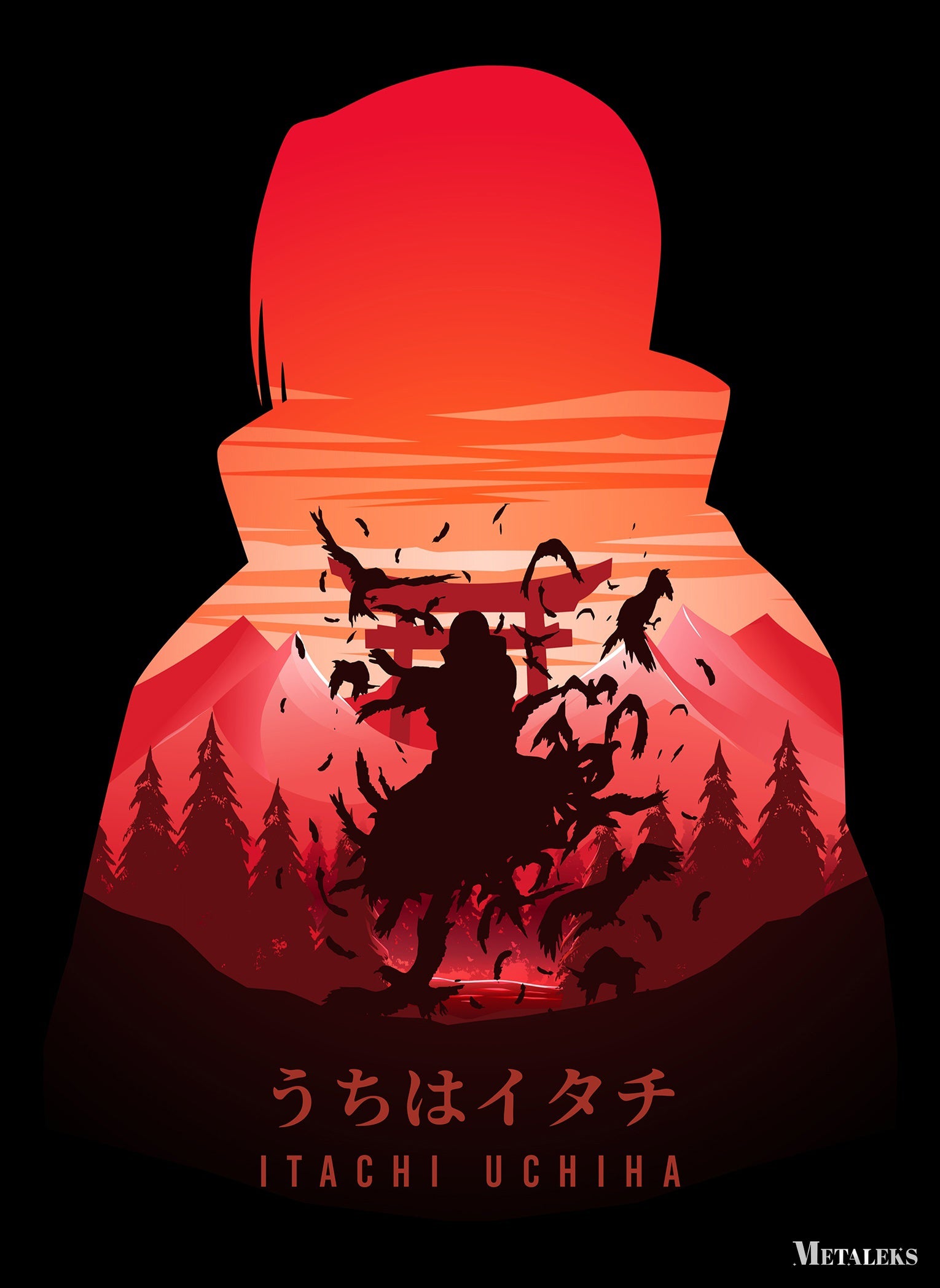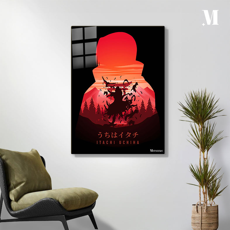 A silhouette of a person with a high collar, set against a red and orange sunset. In the center, there is a dark silhouette of a figure surrounded by birds. Below, the text reads “うちはイタチ” and “ITACHI UCHIHA.” Metaleks Ultra HD Metal Poster – Create Your Passionate Space.
