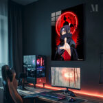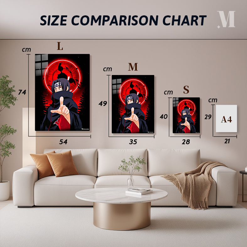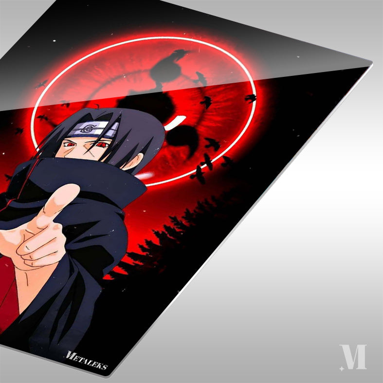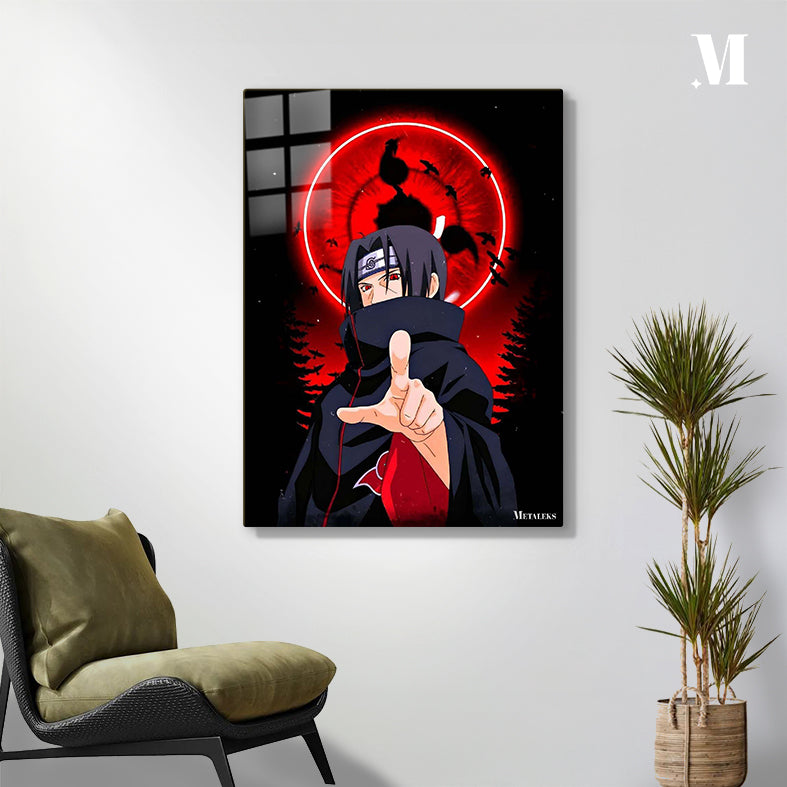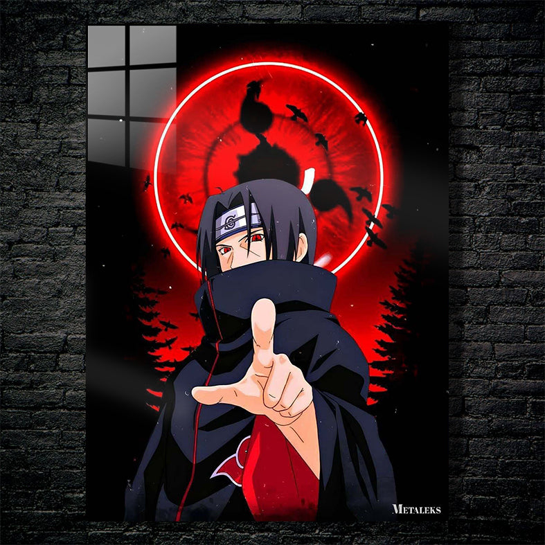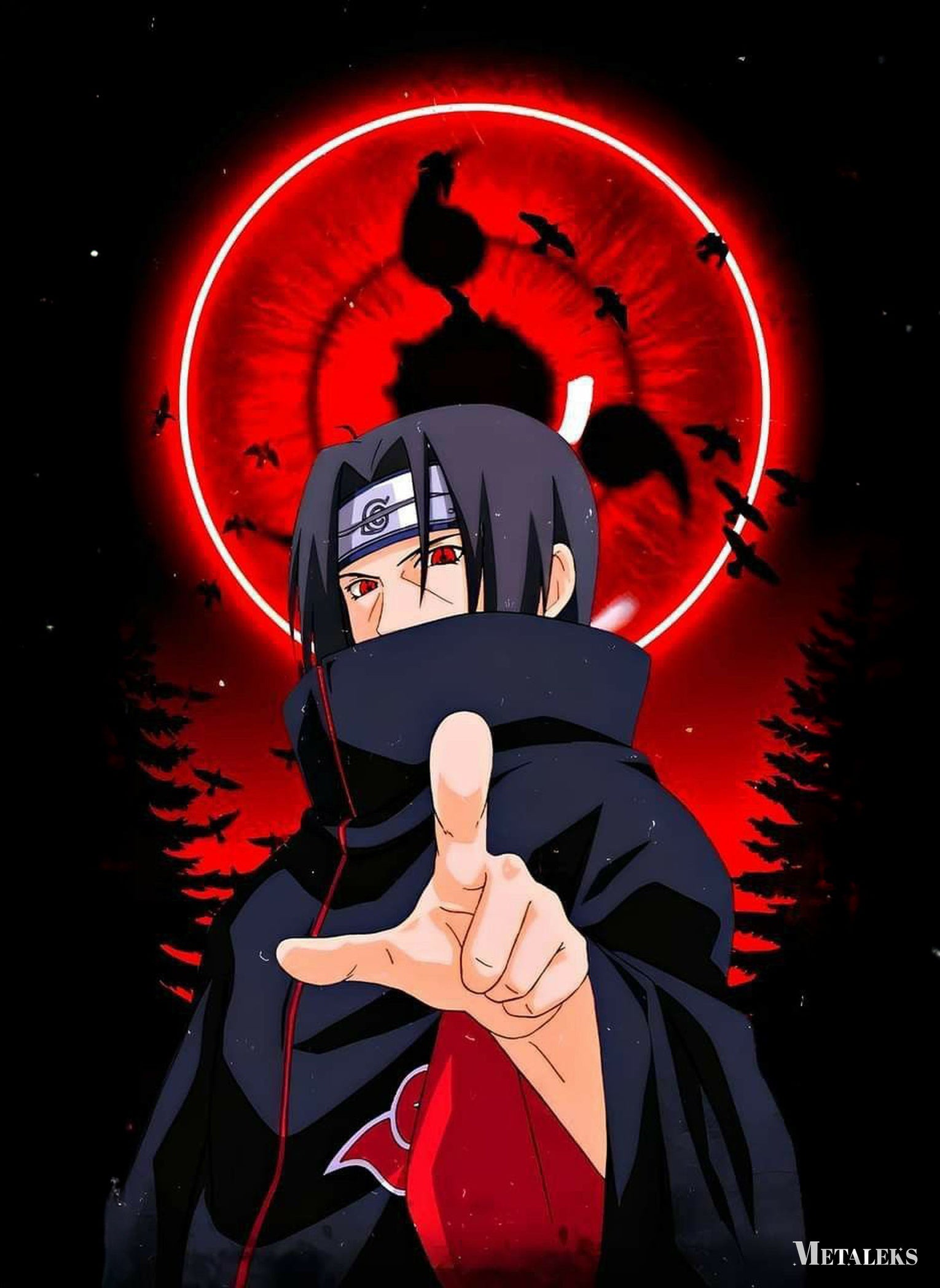 Itachi Uchiha from Naruto is pointing his finger at the viewer. Behind him is a red circle with a Sharingan eye design and silhouettes of crows.