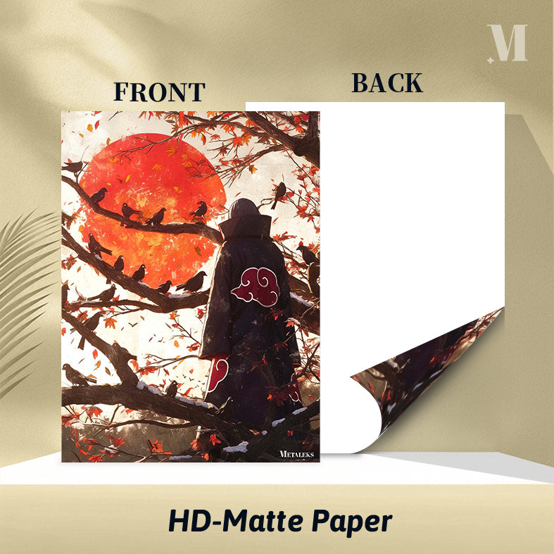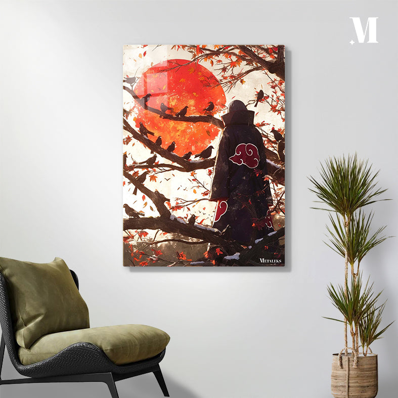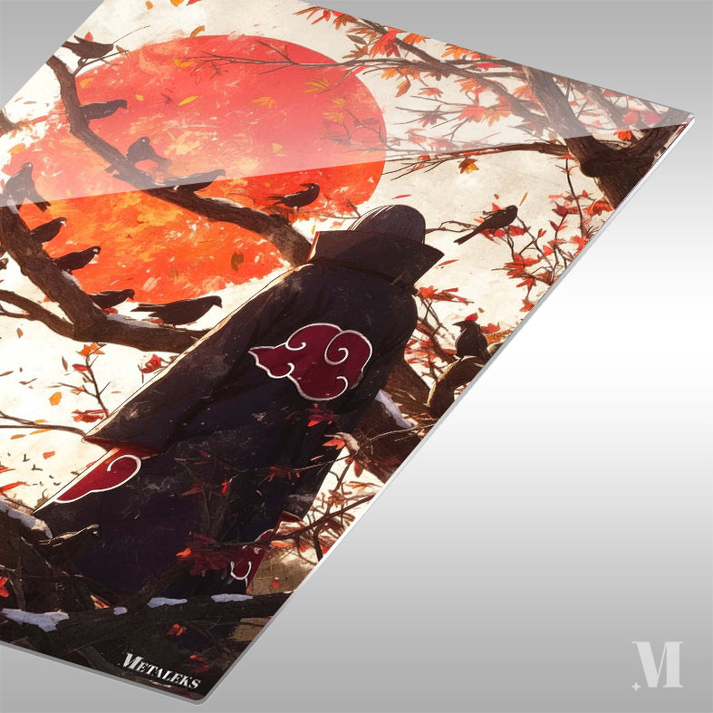 Itachi Uchiha from Naruto is standing in front of a tree with red leaves and black birds perched on the branches. He is wearing a black cloak with a red cloud symbol on the back. Metaleks Ultra HD Metal Poster – Create Your Passionate Space.