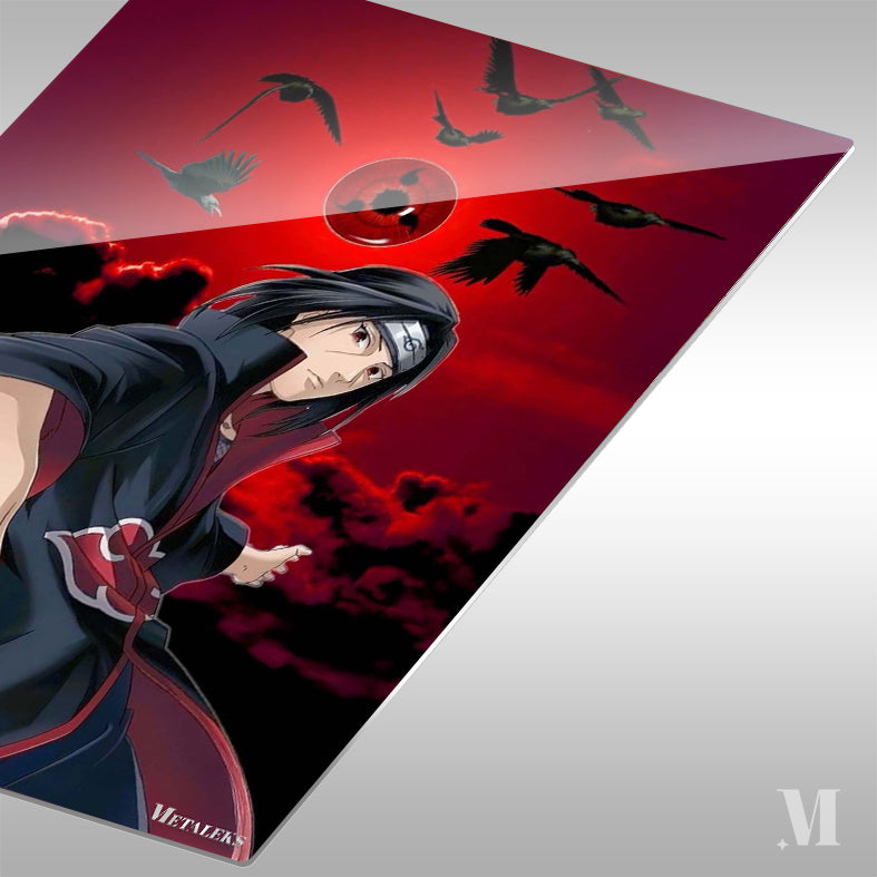 Itachi from Naruto is shown with his hand outstretched, wearing his Akatsuki cloak. Above him is a Sharingan eye surrounded by crows.