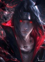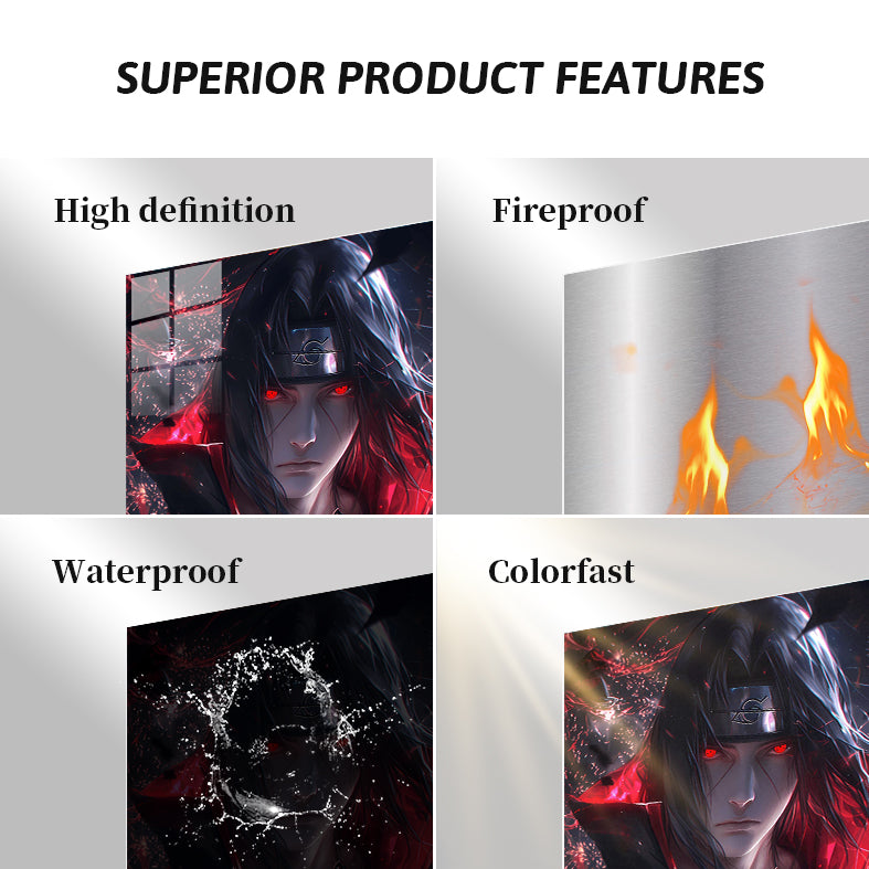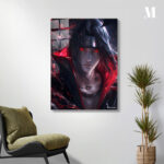 Itachi Uchiha from Naruto has long black hair, a black and red outfit, and red eyes. Metaleks Ultra HD Metal Poster – Create Your Passionate Space.