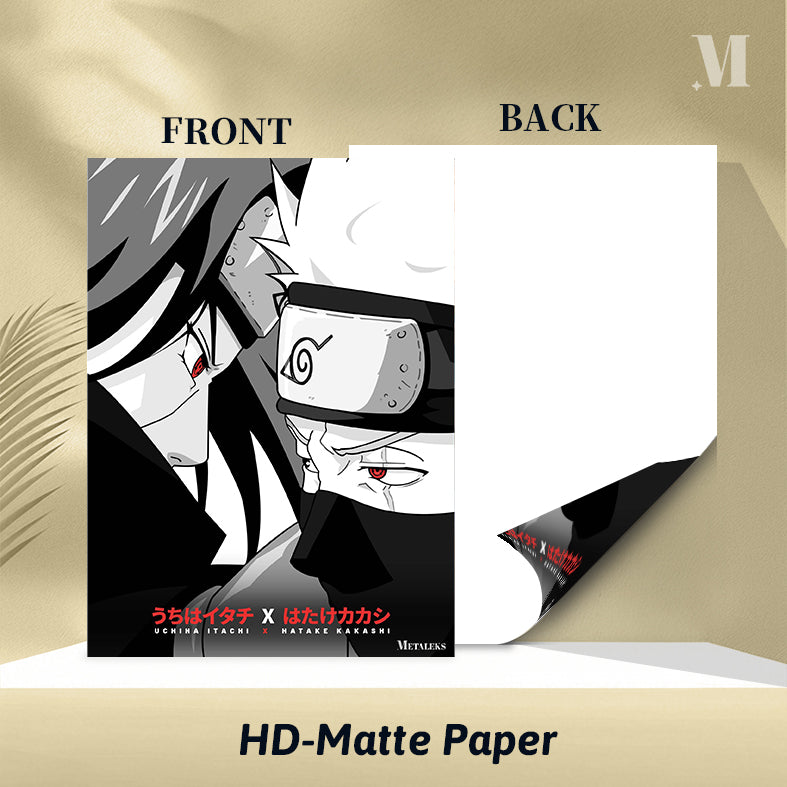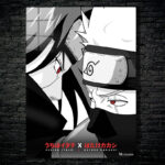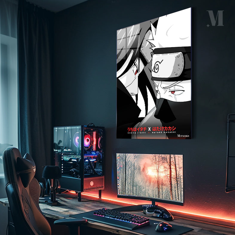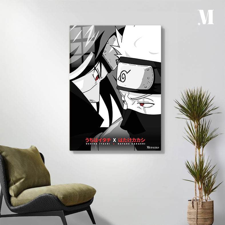 Uchiha Itachi and Hatake Kakashi, characters from the anime Naruto, are depicted in a close-up. Both have red eyes, with Itachi having longer hair and Kakashi wearing a headband and mask. Metaleks Ultra HD Metal Poster – Create Your Passionate Space.