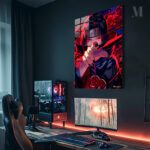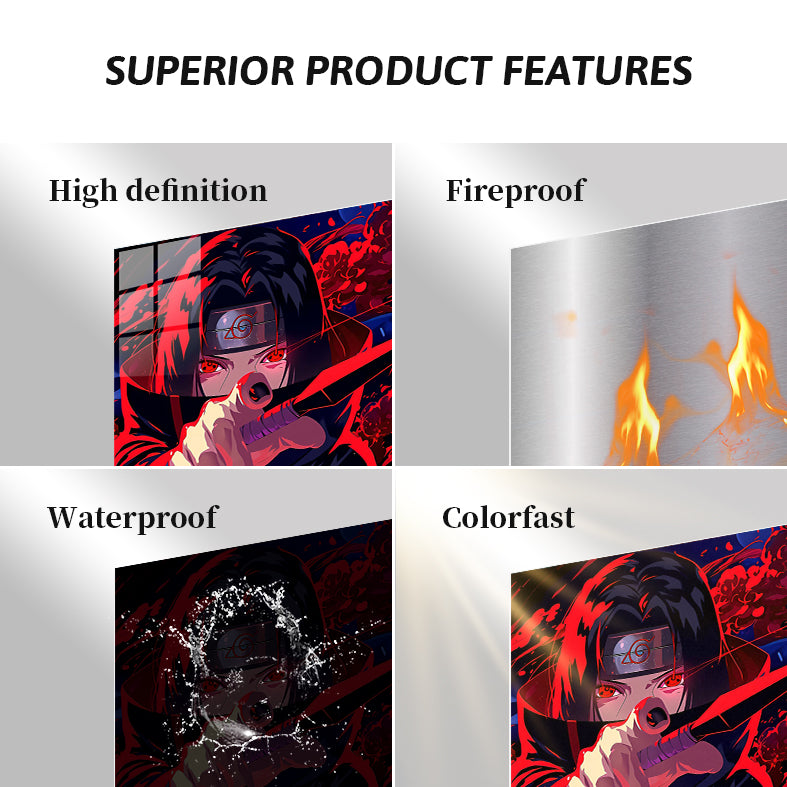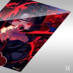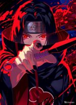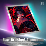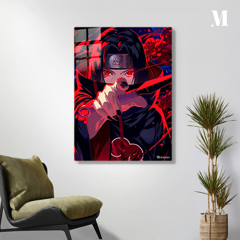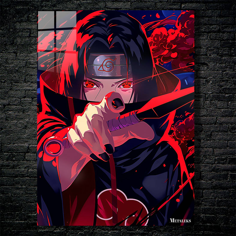 Itachi Uchiha from the anime Naruto is holding a sword with red eyes and a headband. Metaleks Ultra HD Metal Poster – Create Your Passionate Space.