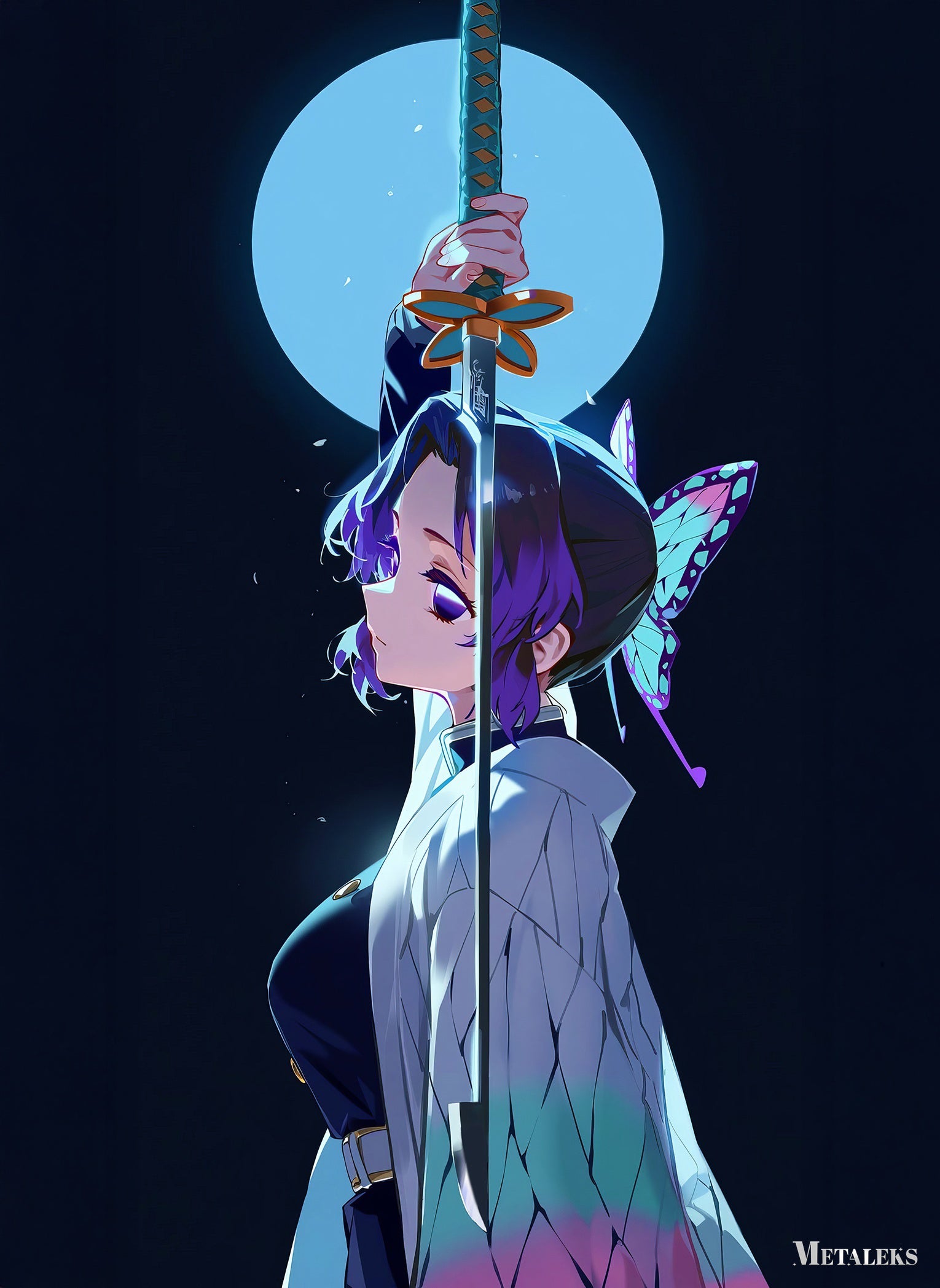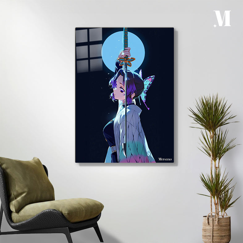Shinobu Kochou from “Demon Slayer: Kimetsu no Yaiba” holds a sword aloft with a full moon in the background. Metaleks Ultra HD Metal Poster – Create Your Passionate Space.