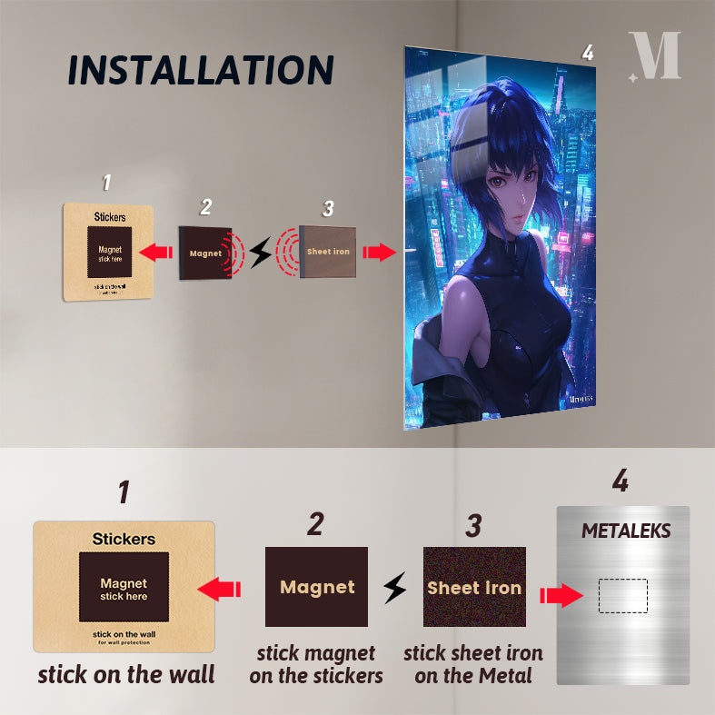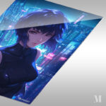 A character from “Ghost in the Shell” with short blue hair, wearing a dark sleeveless outfit, set against a cyberpunk city backdrop. Metaleks Ultra HD Metal Poster – Create Your Passionate Space.