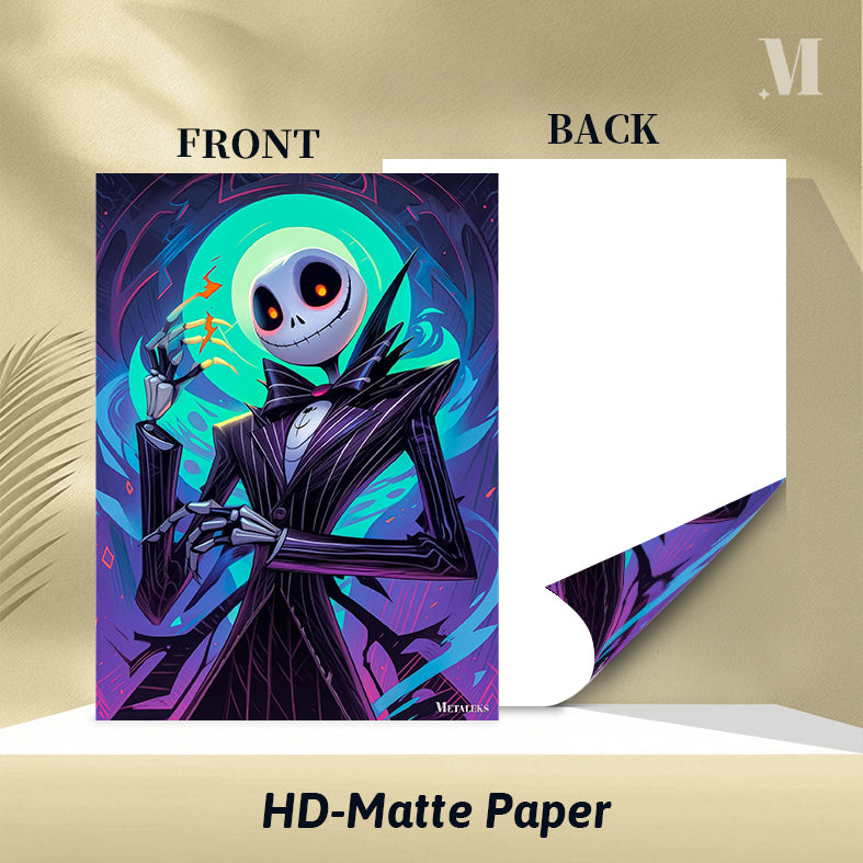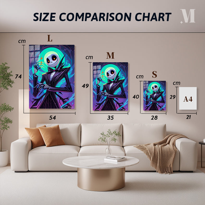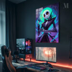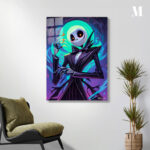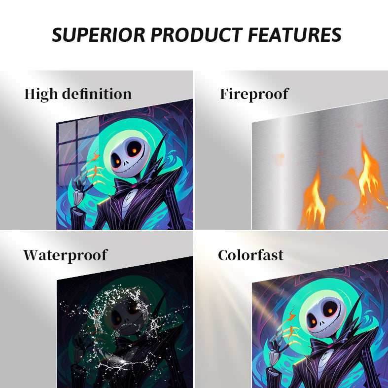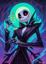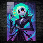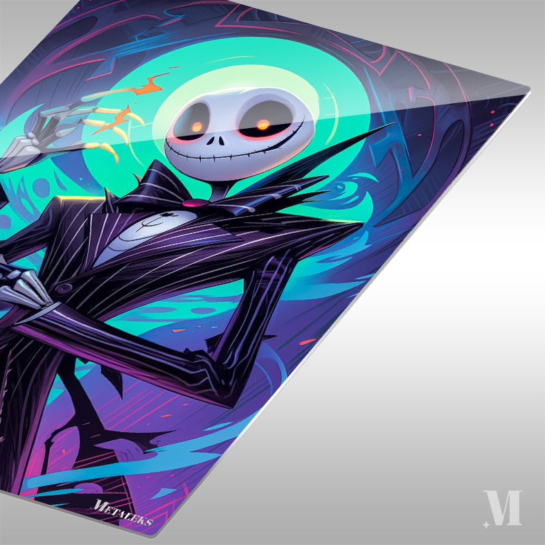 Jack Skellington from “The Nightmare Before Christmas” is depicted in a stylized, colorful illustration. He is wearing a pinstripe suit with a bow tie, and his skeletal hand is raised with glowing orange sparks. His eyes are glowing orange, and he has a wide, mischievous grin. Metaleks Ultra HD Metal Poster – Create Your Passionate Space.