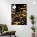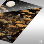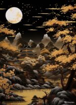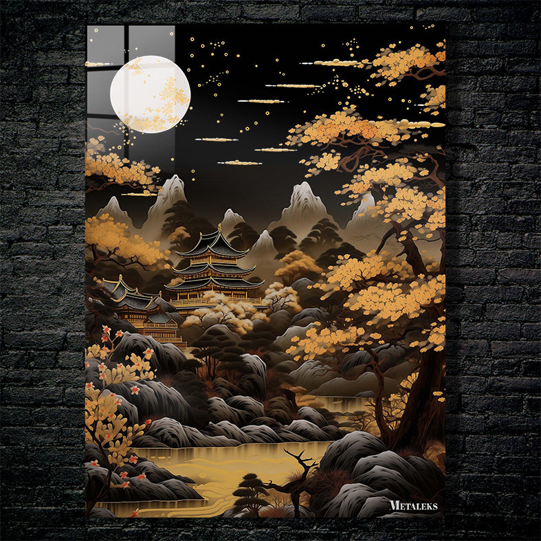 The image depicts a traditional Chinese landscape at night. A large, full moon illuminates the scene, casting a golden glow over the mountains and trees. In the foreground, there are rocky formations and a serene body of water reflecting the moonlight. A prominent feature is a multi-tiered pagoda-style building, surrounded by autumn-colored trees with golden leaves. The background showcases misty mountains, adding depth to the scene. The overall atmosphere is tranquil and picturesque, evoking a sense of timeless beauty. Metaleks Ultra HD Metal Poster – Create Your Passionate Space.