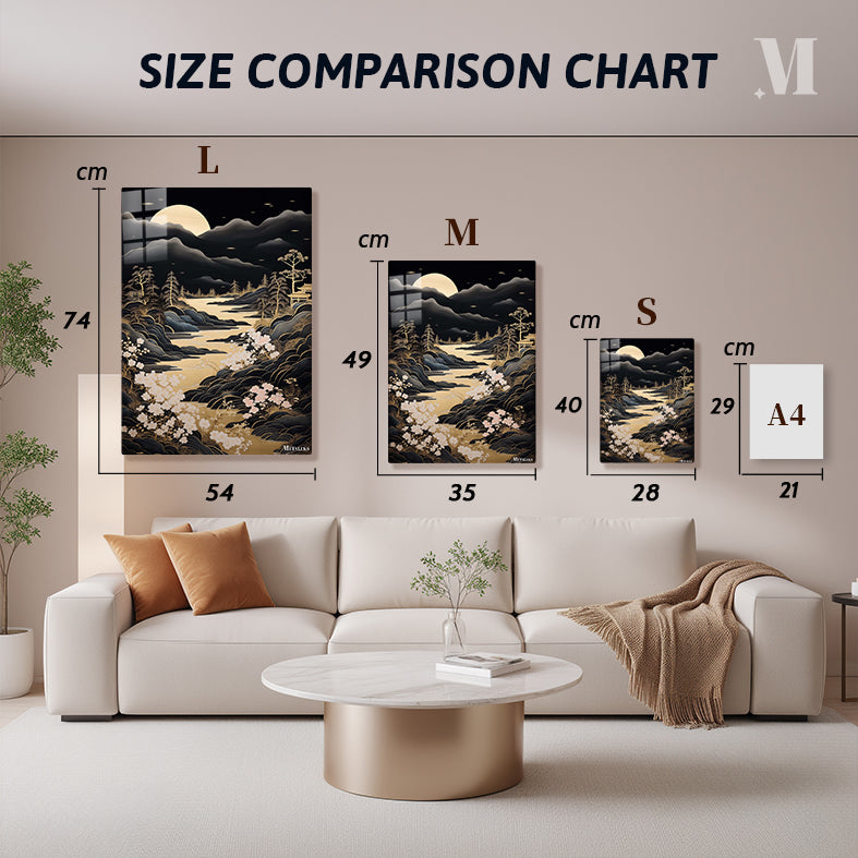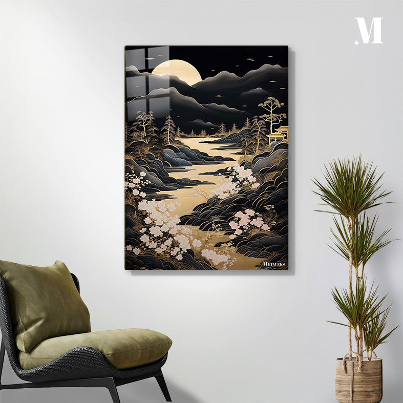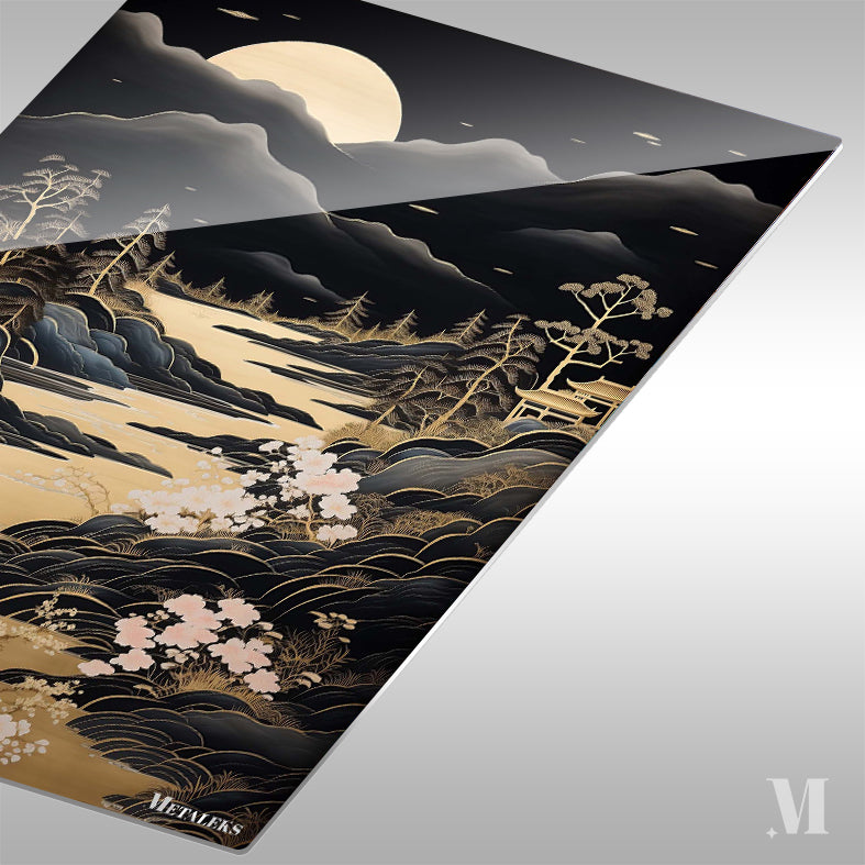 A serene landscape at night with a full moon, mountains, a river, trees, and blooming flowers. Metaleks Ultra HD Metal Poster – Create Your Passionate Space.