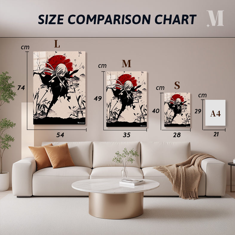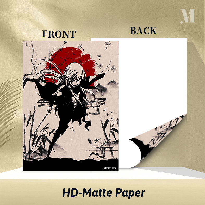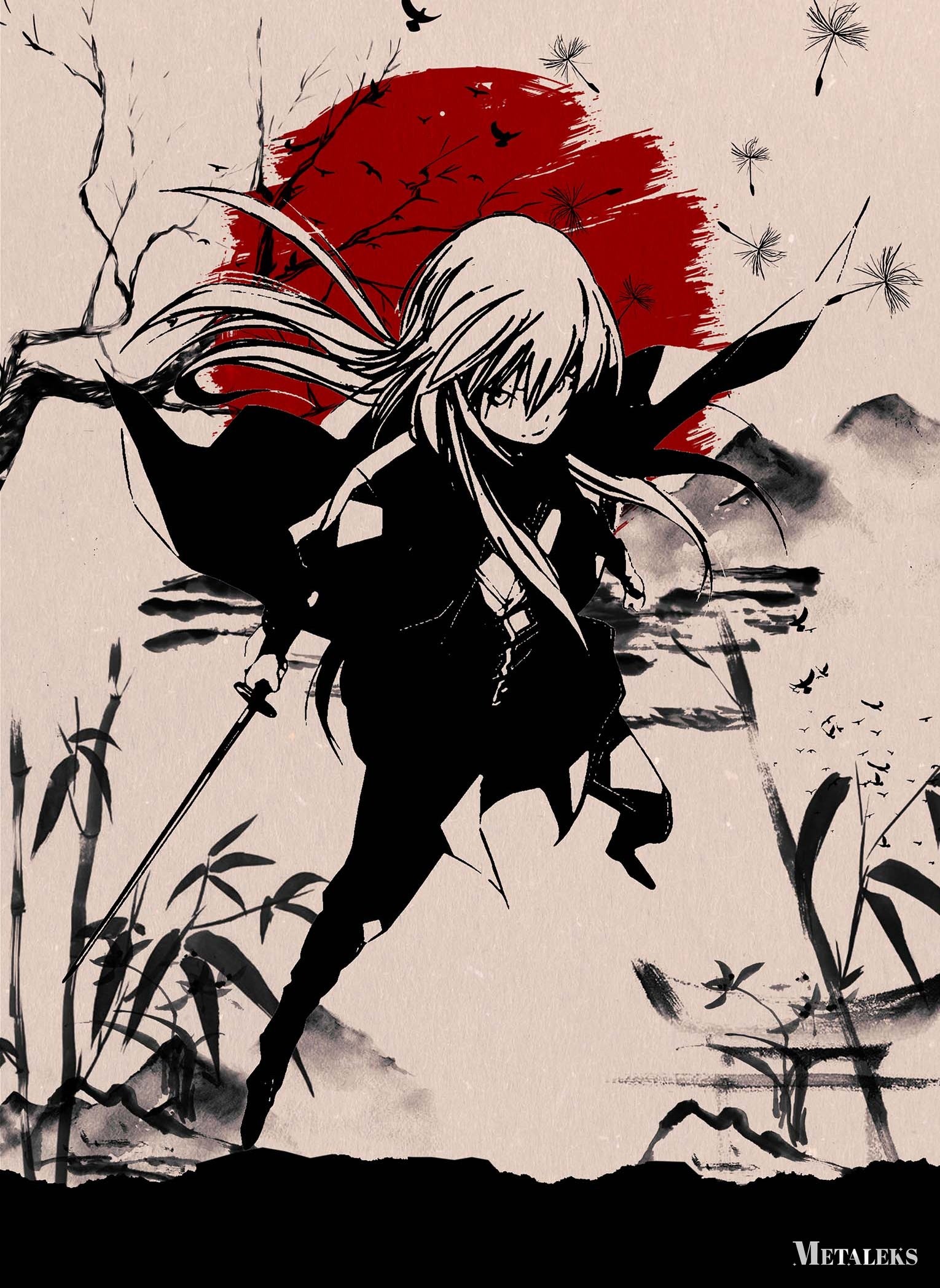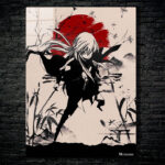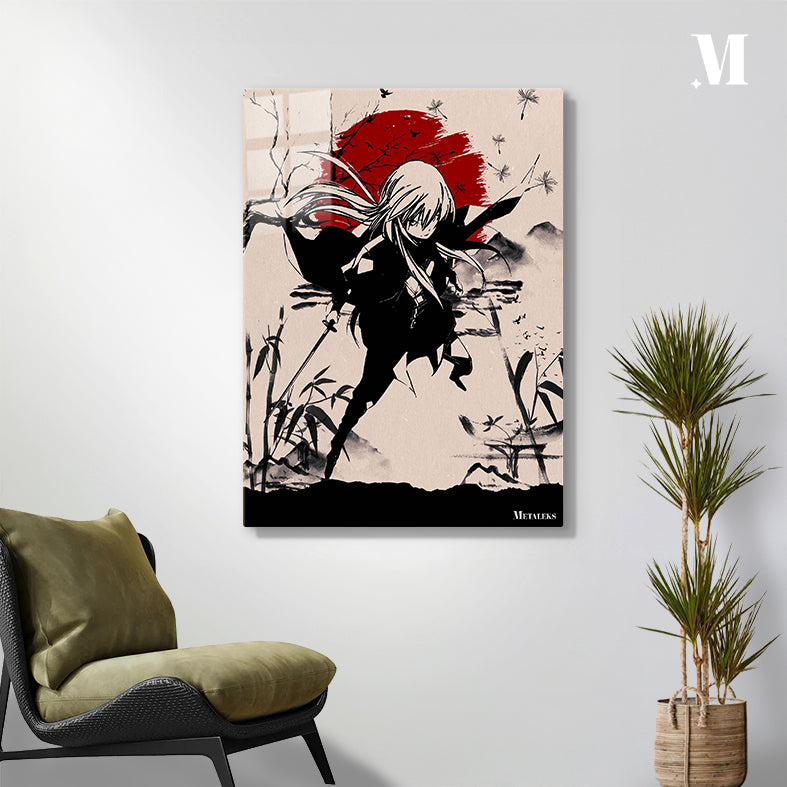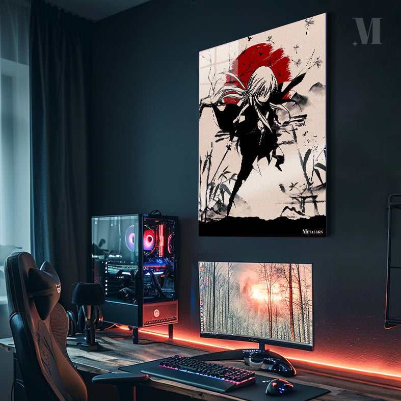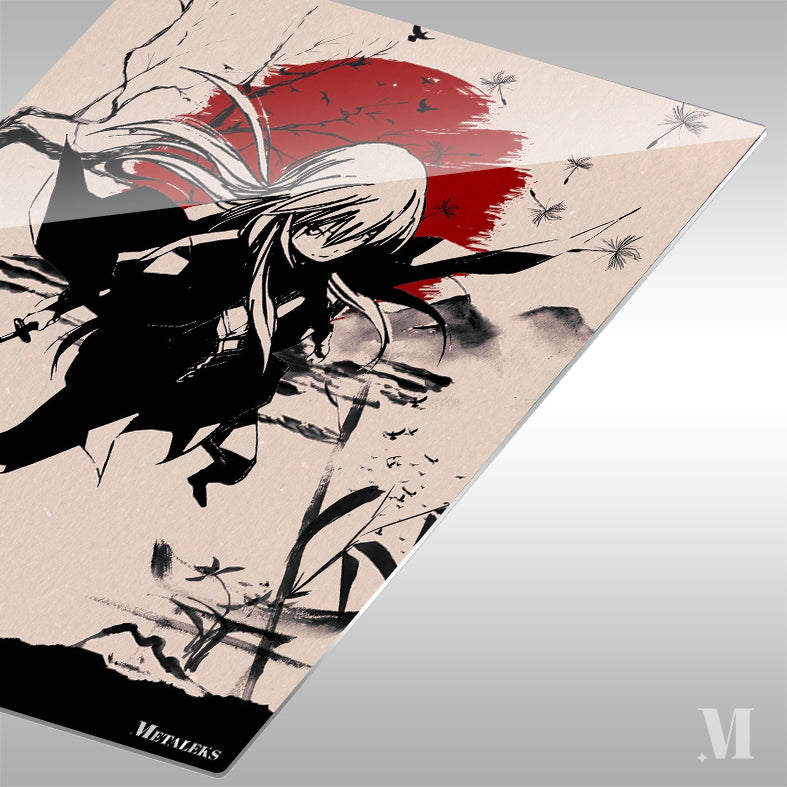 The image features a dynamic character with long flowing hair, dressed in a black outfit, wielding a sword. The character appears to be in motion, suggesting an action scene. The background includes elements like a red sun, bamboo, and dandelions, adding to the artistic and dramatic atmosphere. Metaleks Ultra HD Metal Poster – Create Your Passionate Space.