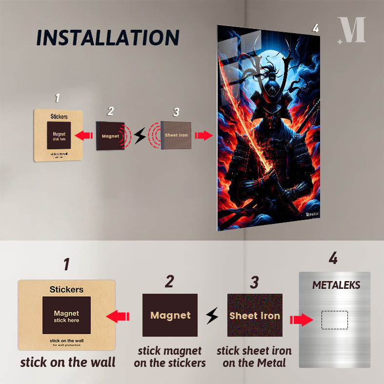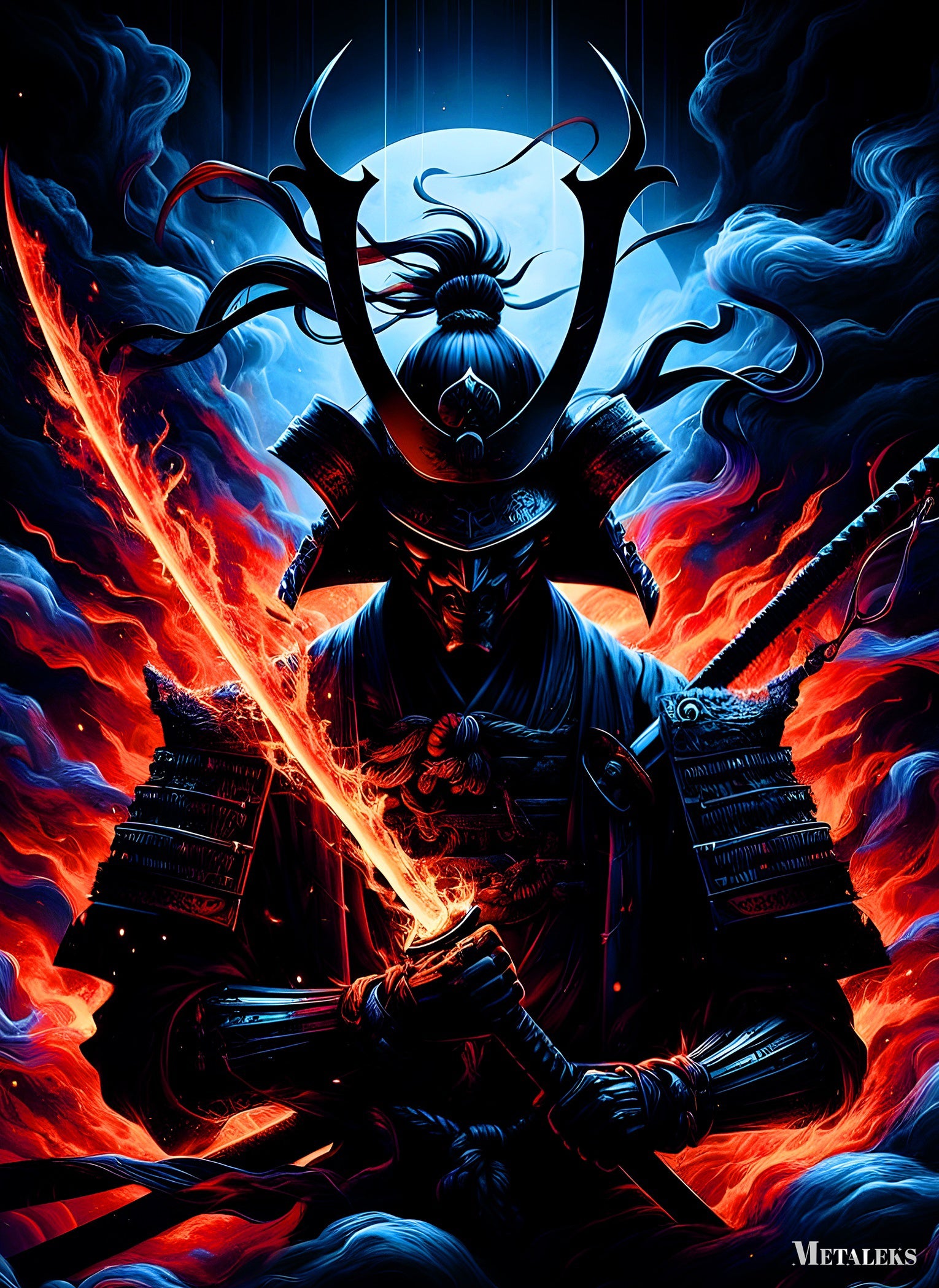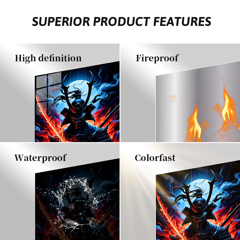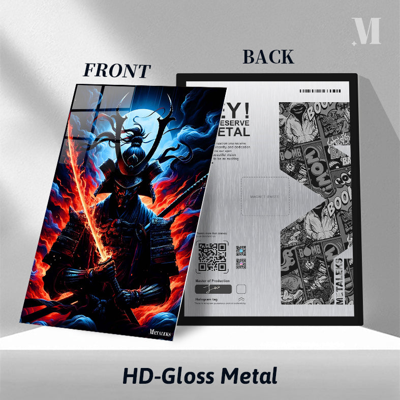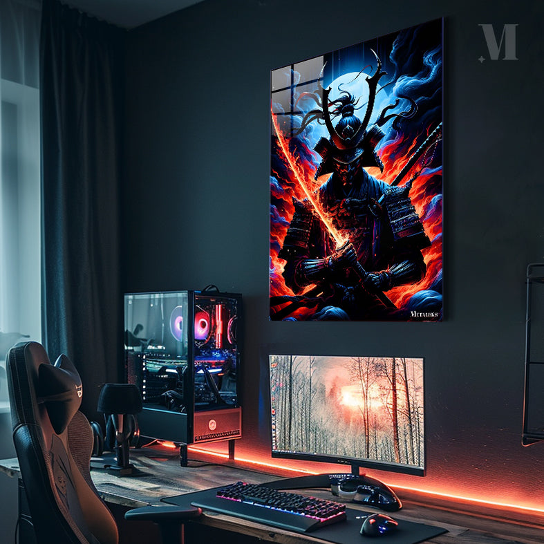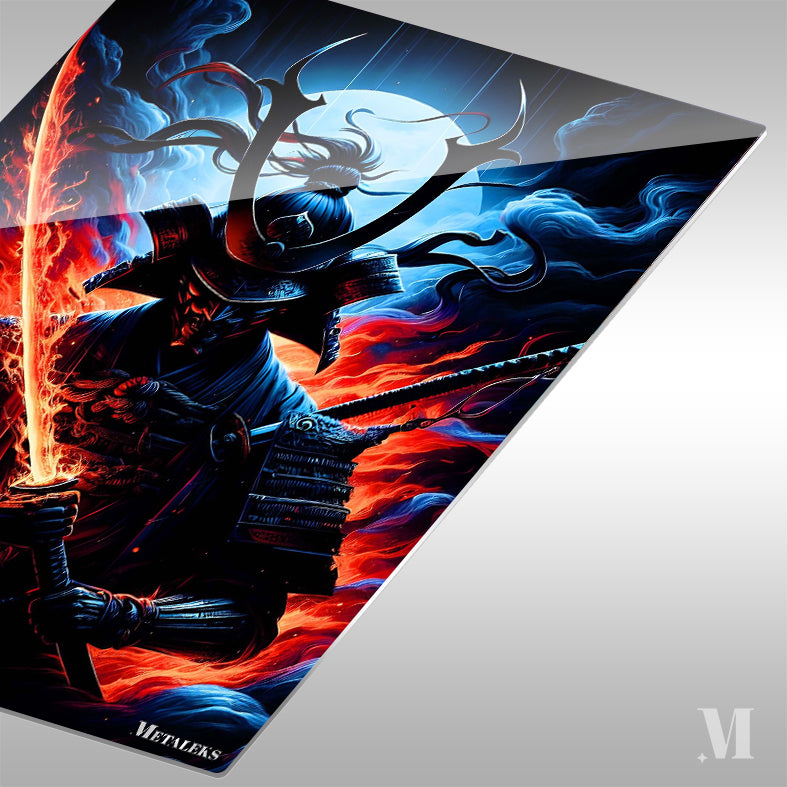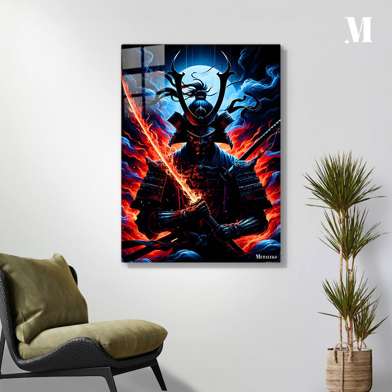 A samurai in traditional armor holds a sword with a glowing, fiery blade. Metaleks Ultra HD Metal Poster – Create Your Passionate Space.