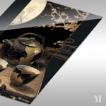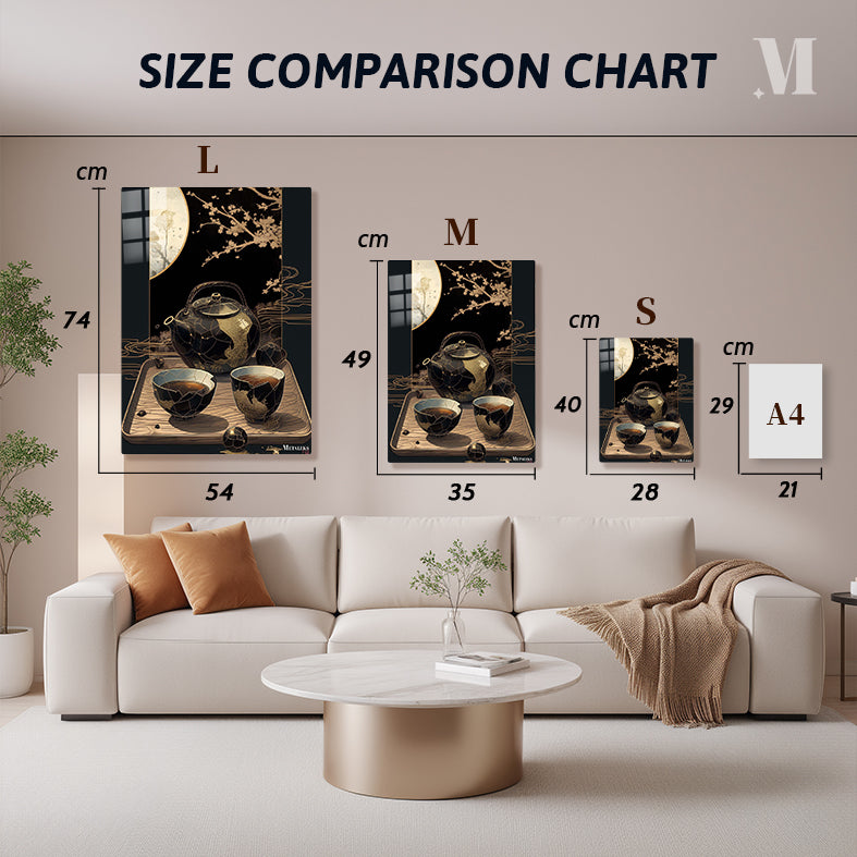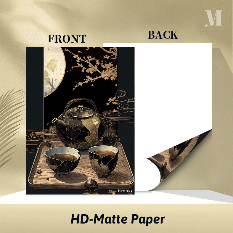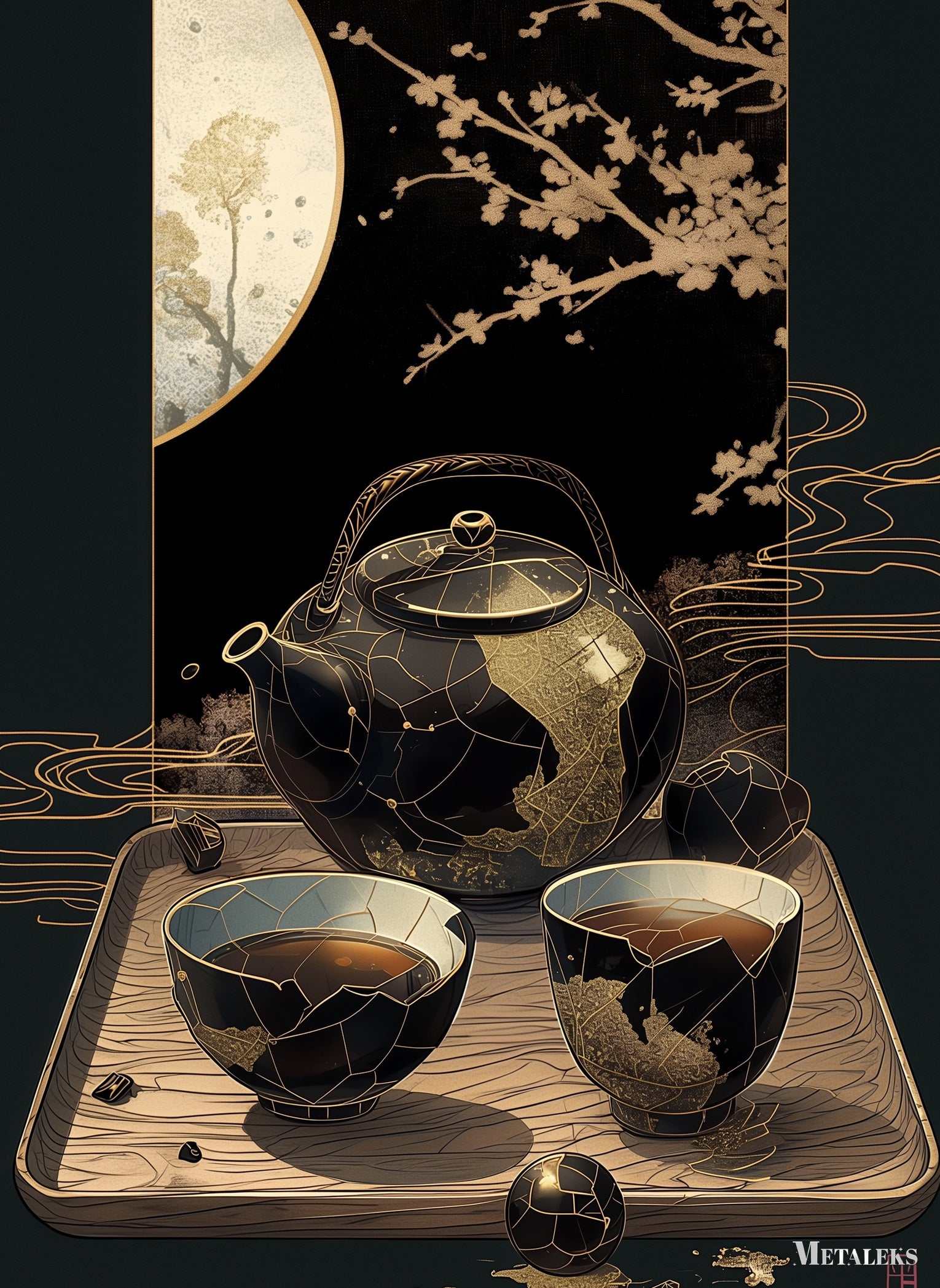 A black and gold teapot with a handle, placed on a wooden tray. In front of the teapot are two black and gold cups filled with tea. Metaleks Ultra HD Metal Poster – Create Your Passionate Space.