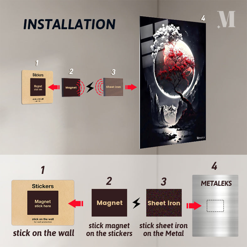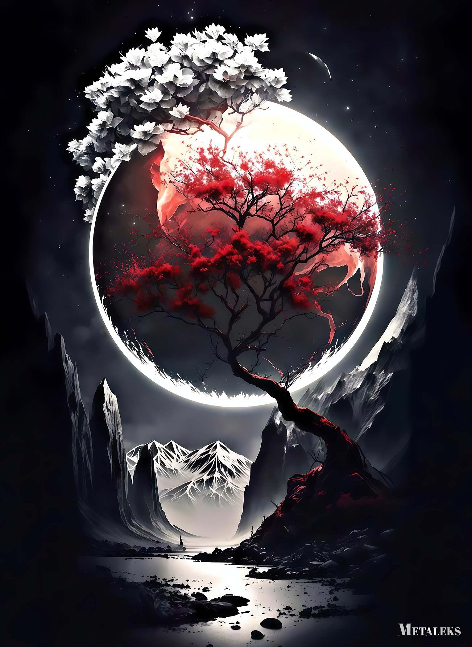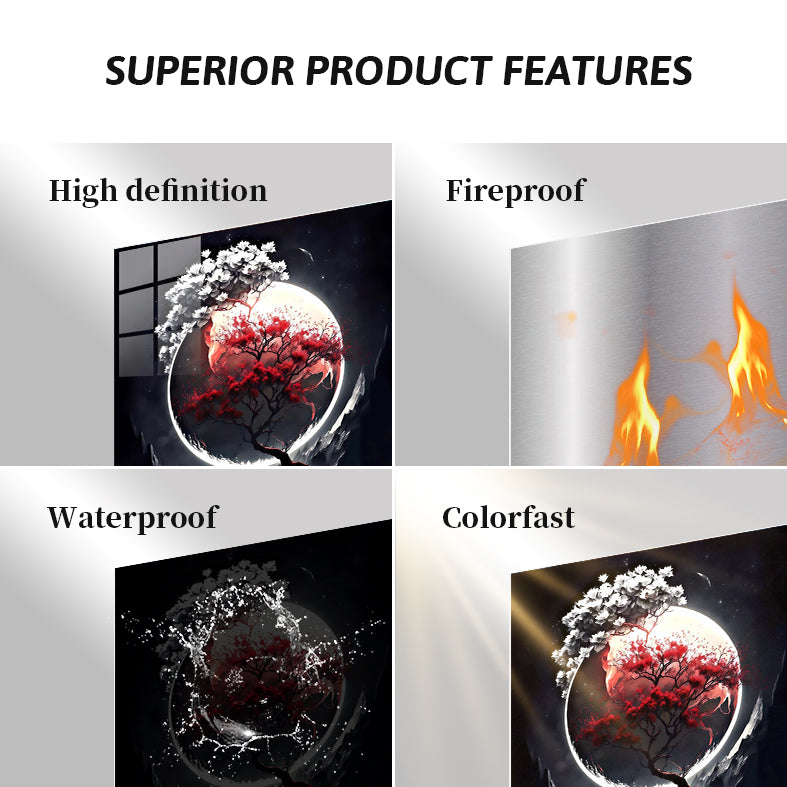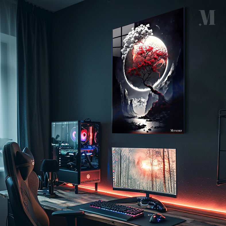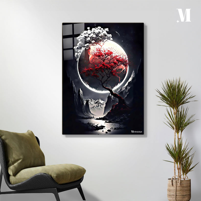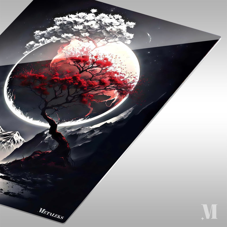 A tree with red leaves and a branch with white flowers against a large moon. Metaleks Ultra HD Metal Poster – Create Your Passionate Space.