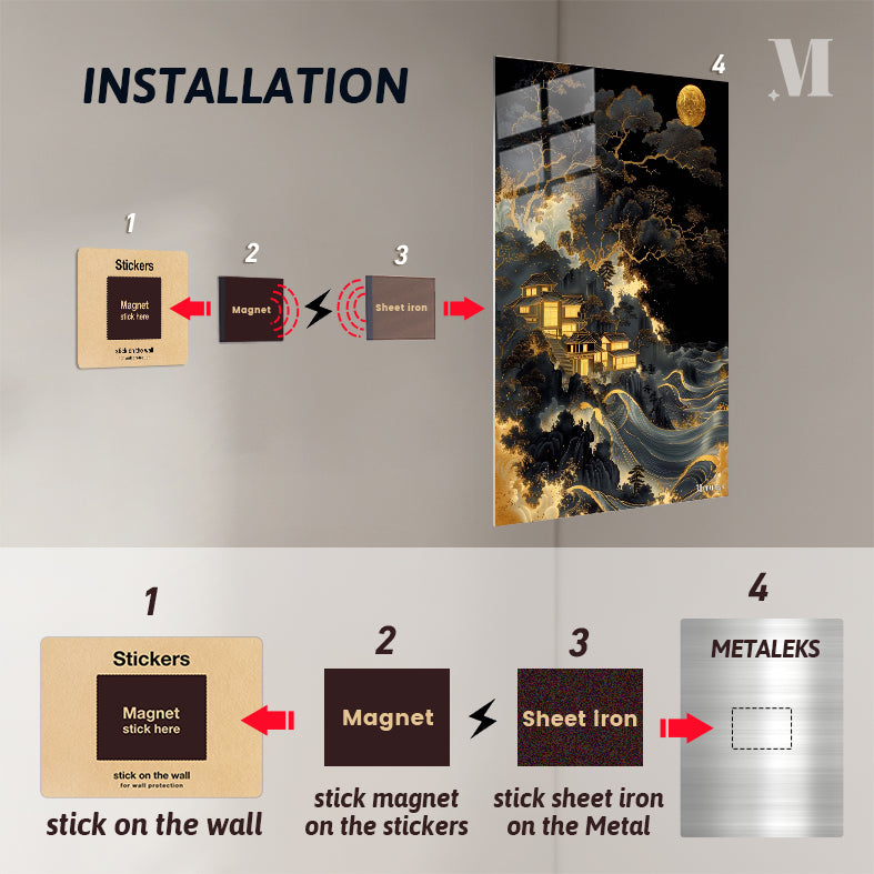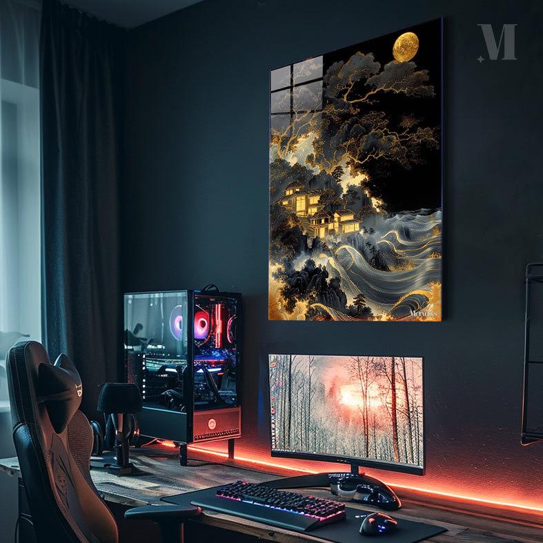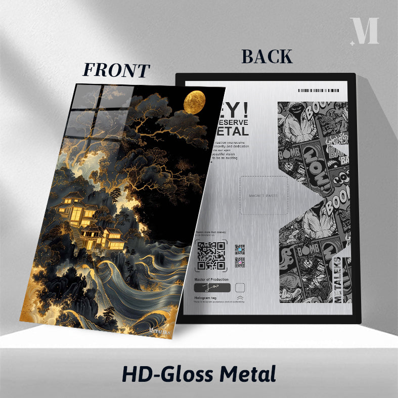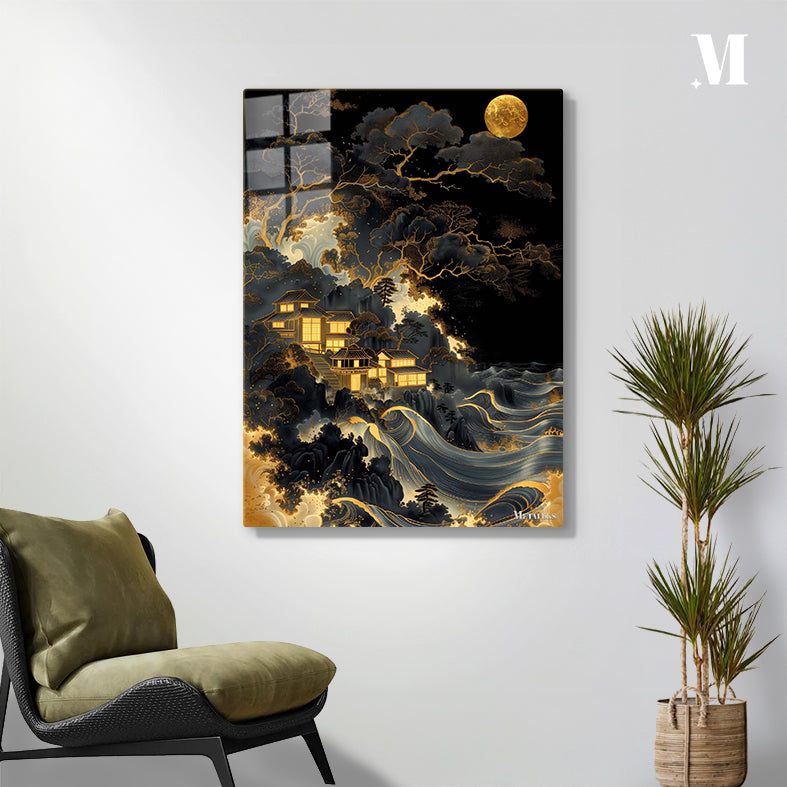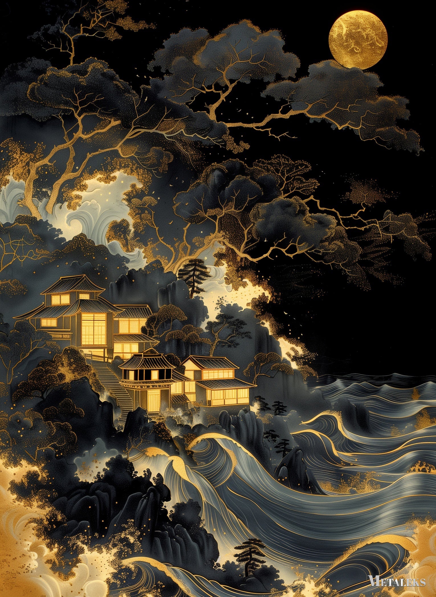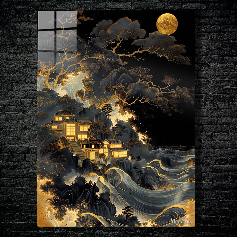 The image depicts a serene nighttime scene featuring traditional Japanese-style buildings nestled among dark, intricately detailed trees. The buildings are illuminated with a warm, golden light, creating a contrast against the dark surroundings. Below the buildings, there are stylized waves with golden accents, adding a dynamic element to the composition. A large, glowing moon hangs in the sky, casting a soft light over the entire scene. Metaleks Ultra HD Metal Poster – Create Your Passionate Space.