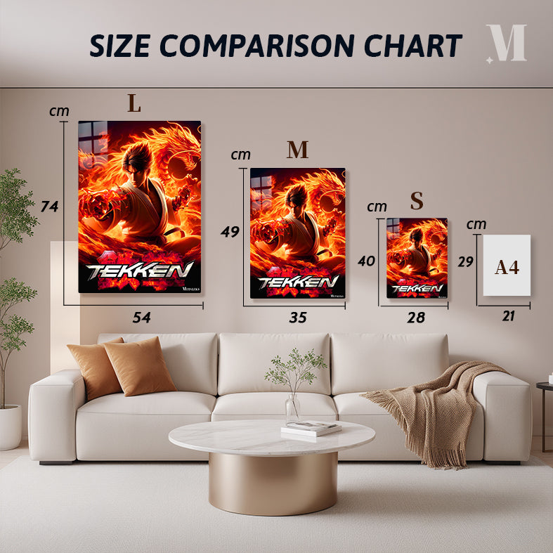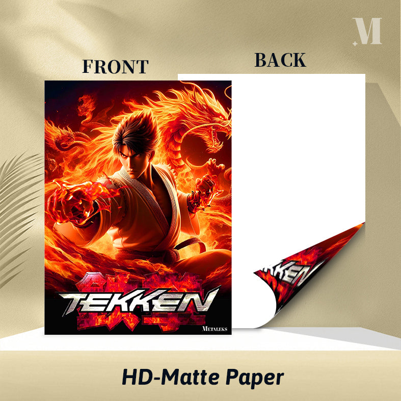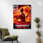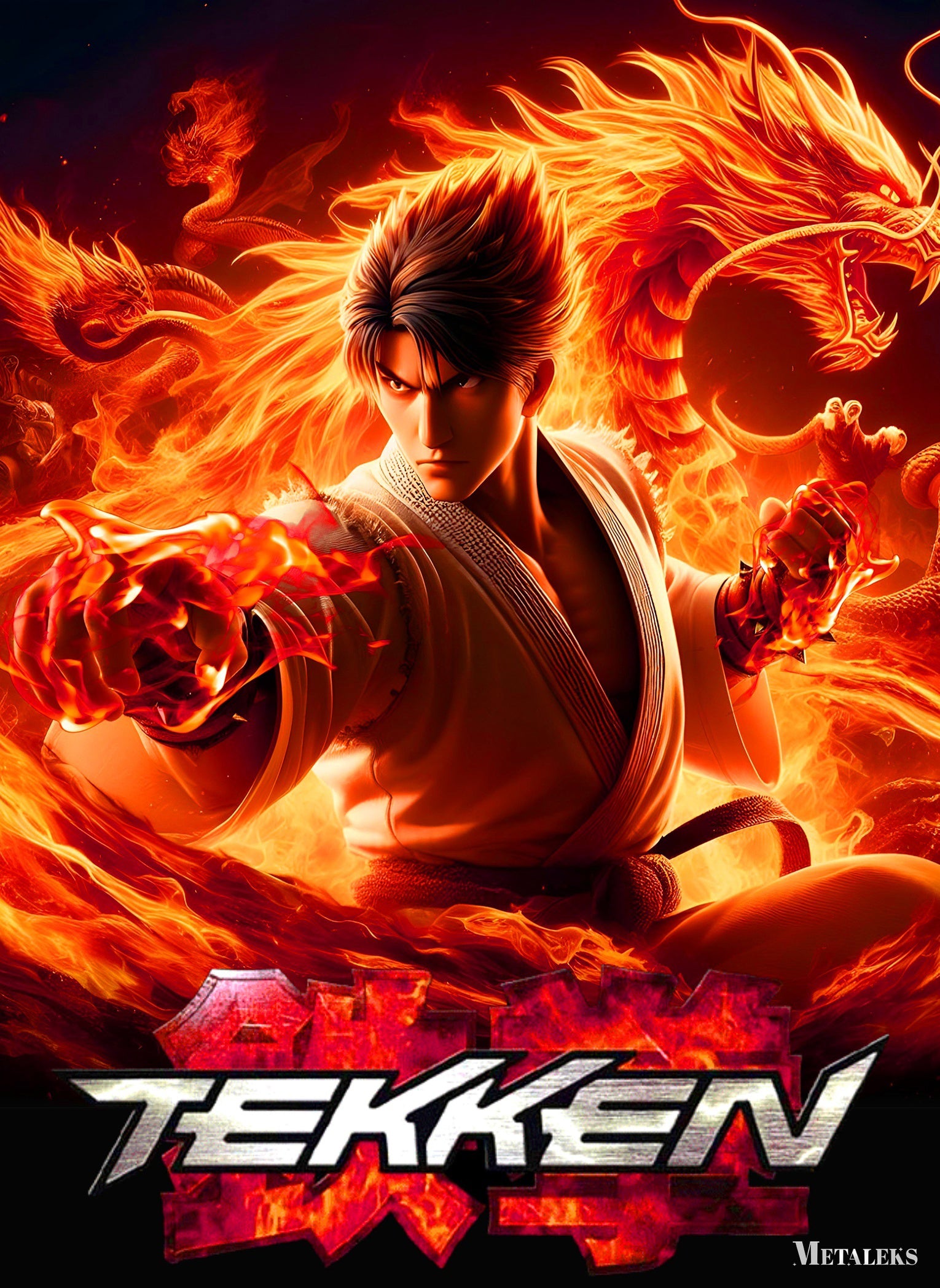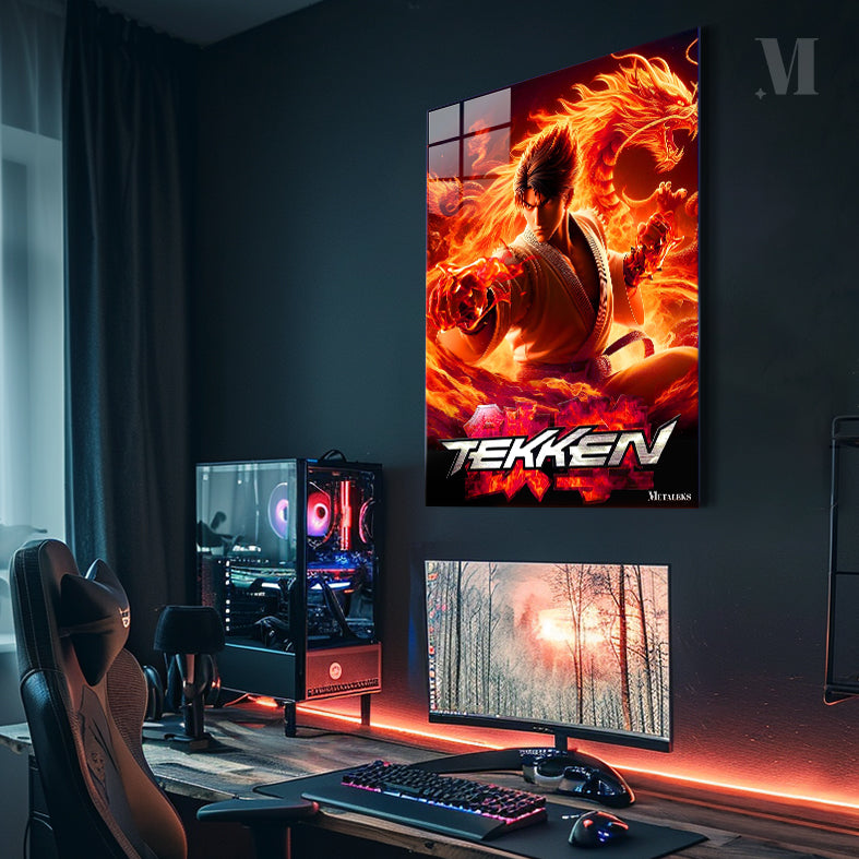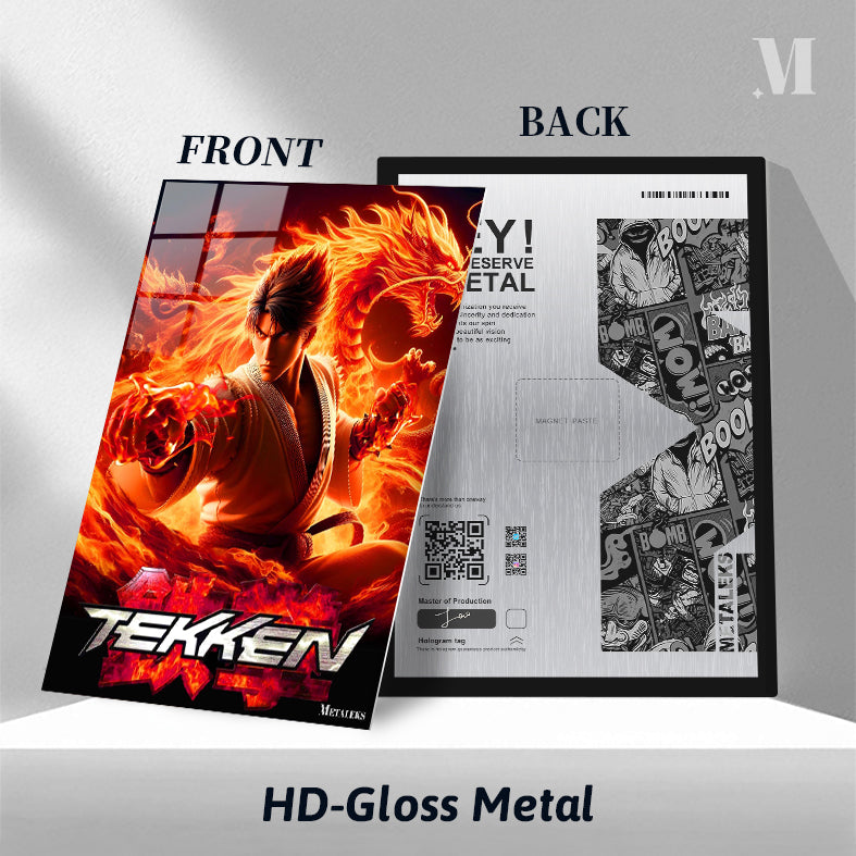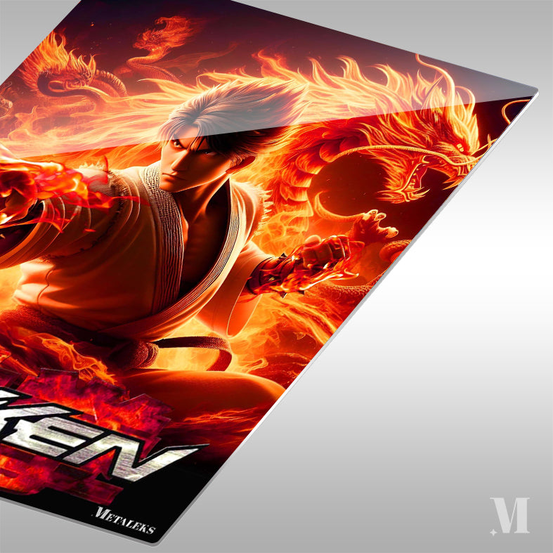 Jin Kazama from the “Tekken” video game series is depicted in a dynamic pose, surrounded by flames and dragons. Metaleks Ultra HD Metal Poster – Create Your Passionate Space.
